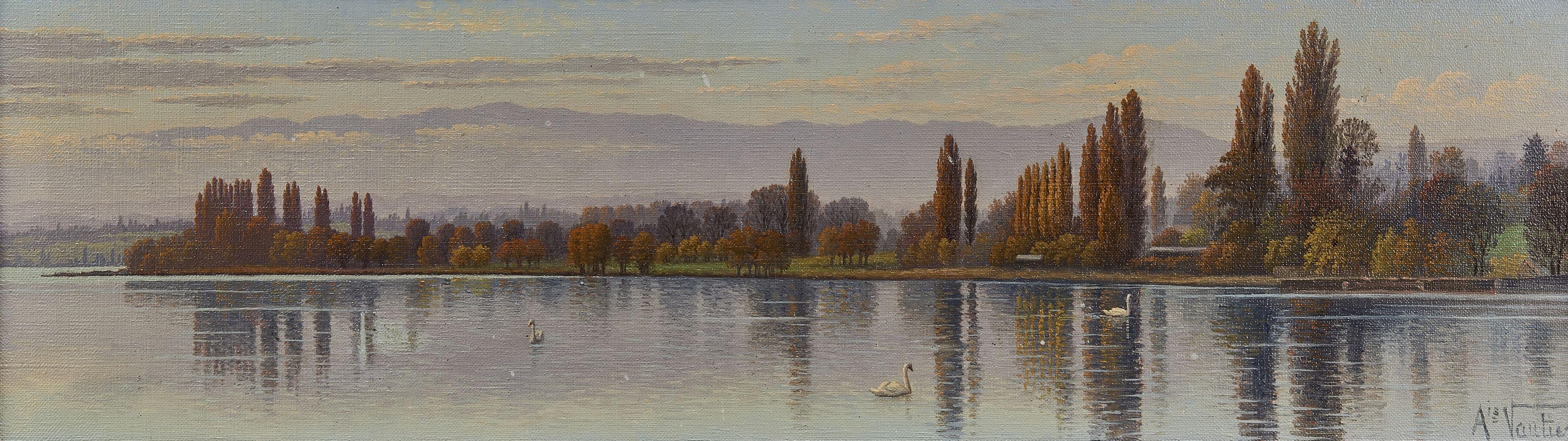 Bord du lac Léman, huile sur toile, signée, 26x72 cm