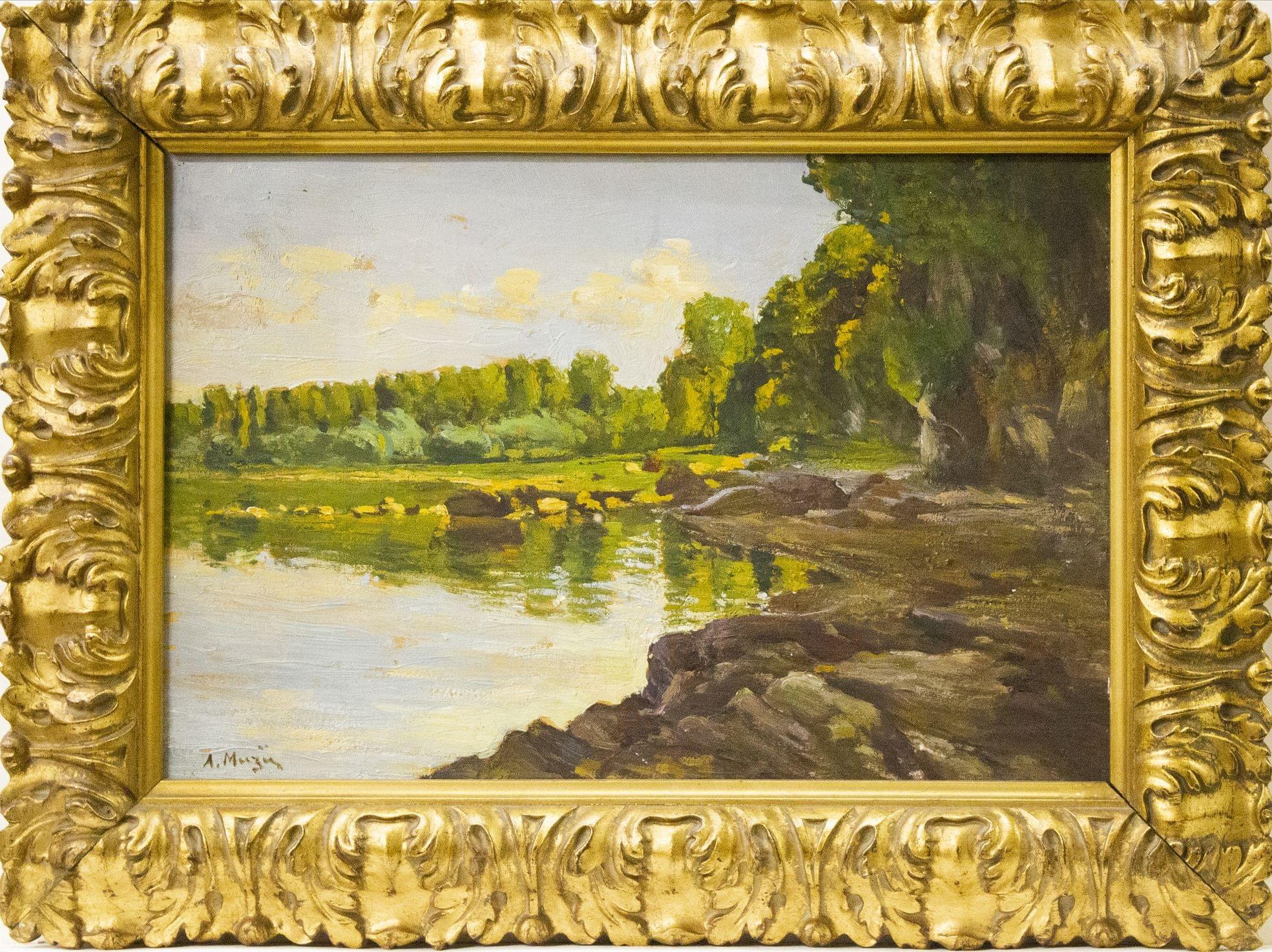 Paysage lacustre, huile sur panneau, signée, 28x42 cm