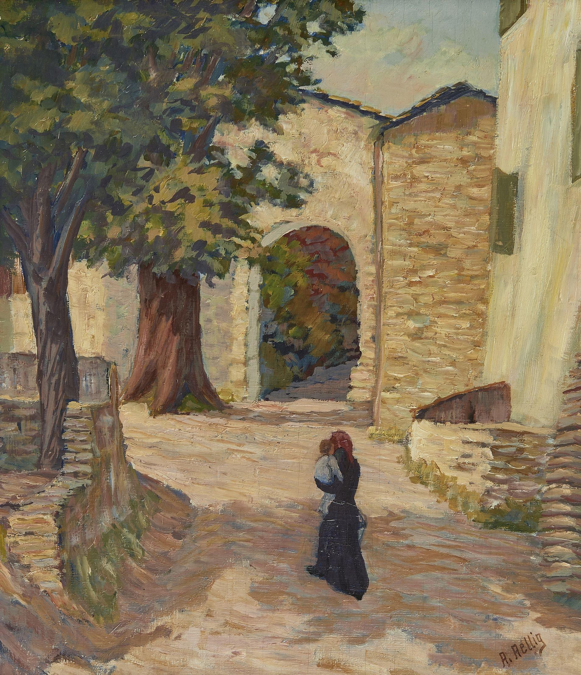 Entrée du château, huile sur bois, signée, 42,5x37,5 cm