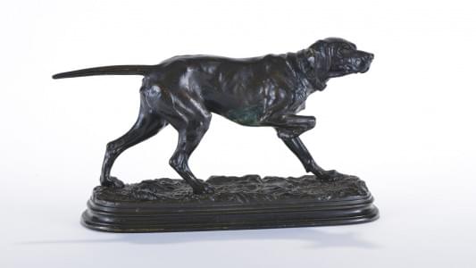 Chien de chasse, bronze à patine brune signé, 17x30x10 cm