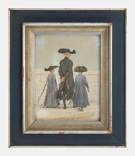 Trois personnages de dos, aquarelle sur papier, 11x8,5 cm