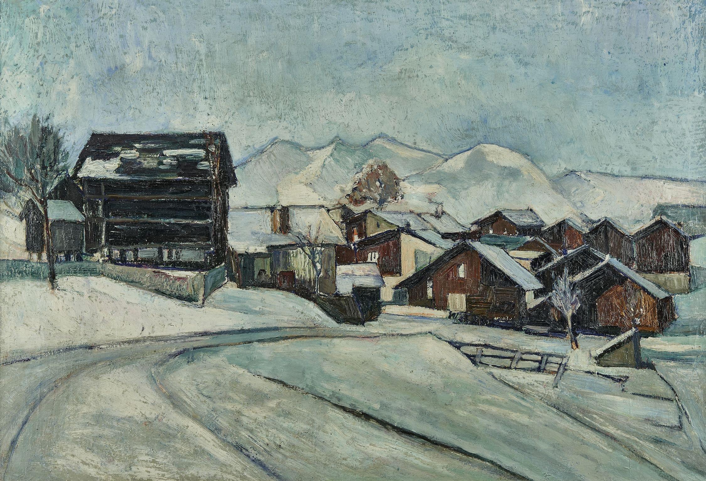Village de montagne sous la neige, huile sur toile, signée, 63x92 cm