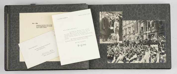 Ensemble de six albums in-4°, reliés en chagrin noir et blanc, réunissant près de 500 photographies des principaux évènements survenus entre 1933 et 1938 (sans la 5ème année, 1937). L’exemplaire est un exemplaire de présent : trois des albums sont enrichis d’une lettre dactylographiée, signée de la main de Joseph Goebbels, adressée à l’ambassadeur de le la Confédération Helvétique à Berlin, datée du 21 Mars 1934, de Mars 1936 (année des Jeux Olympiques tenus à Berlin) et de Mars 1937.