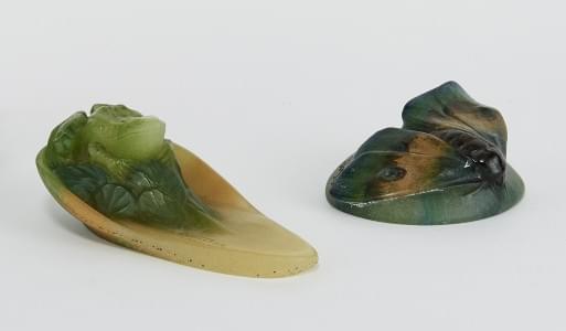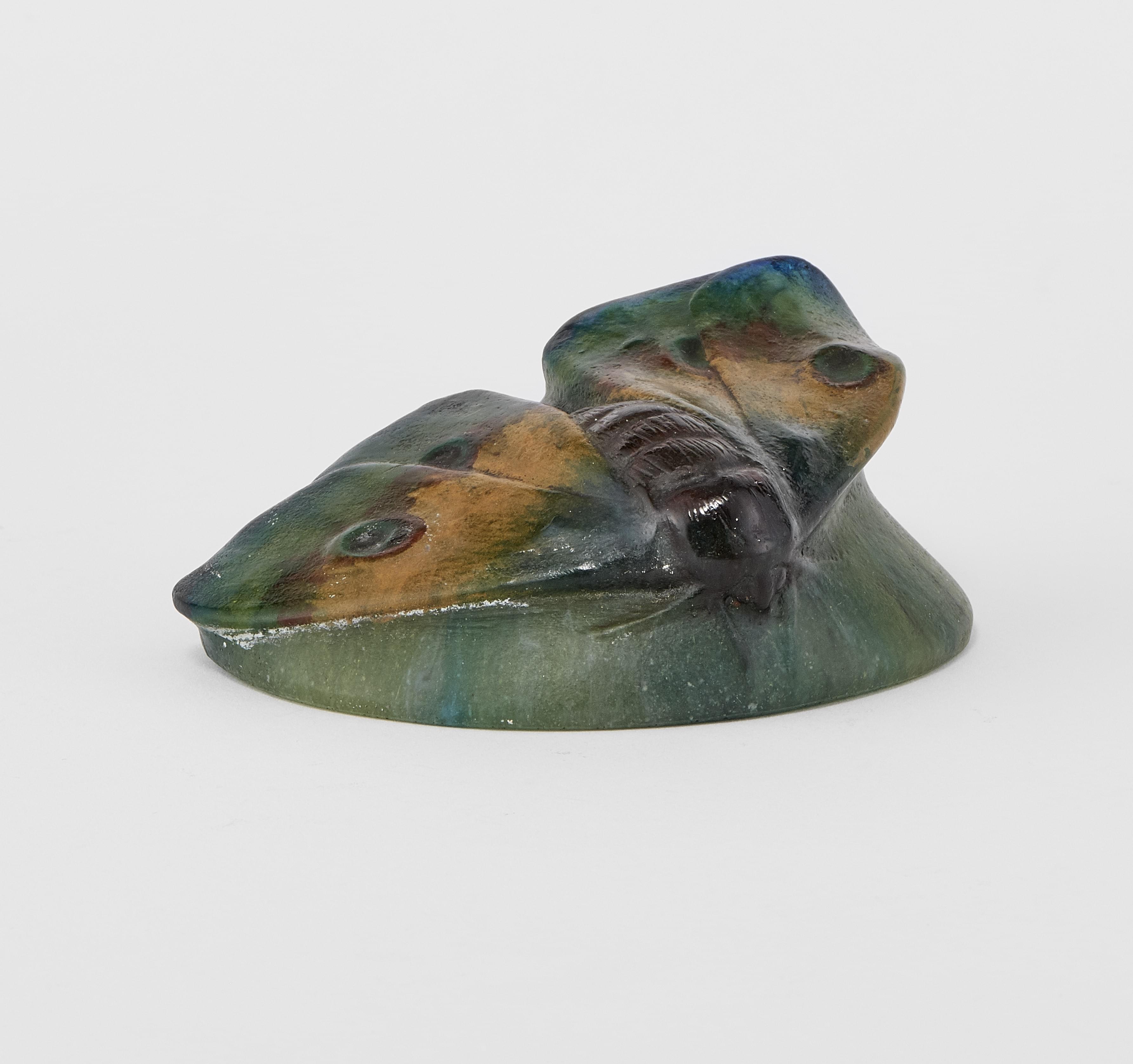 Vide-poche grenouille (raboté) et presse-papier bombyx: deux sujets en pâte de verre, L 10 et 15 cm