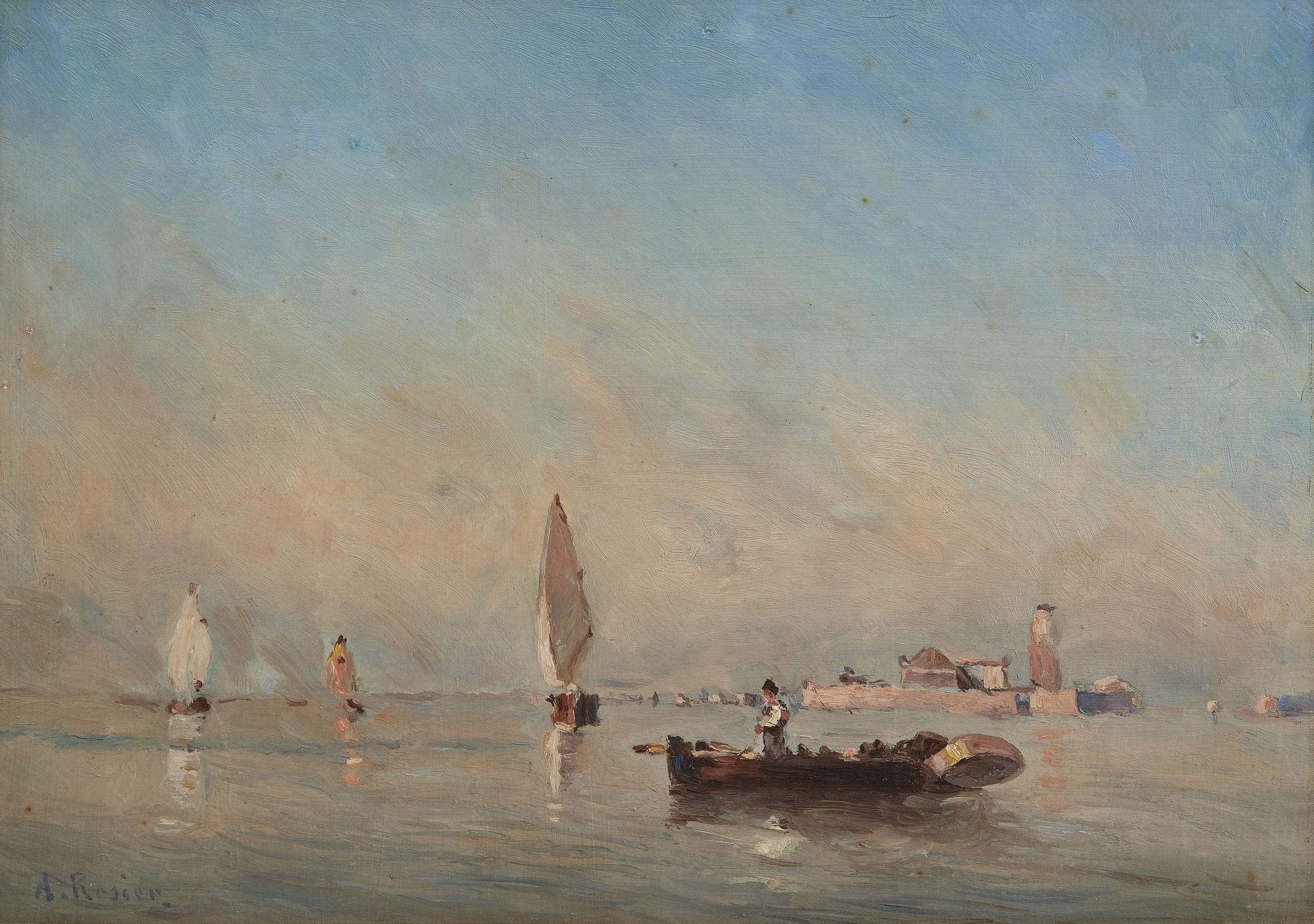 Barques au soleil couchant, lagune de Venise, huile sur carton, 23x32 cm