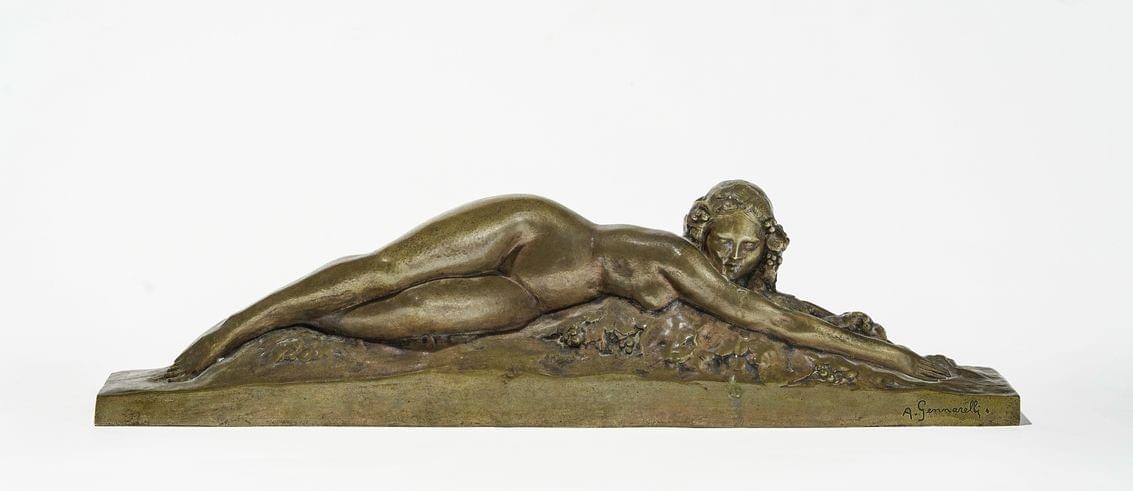 Femme nue allongée, bronze à patine dorée, signé, L 64,5 cm