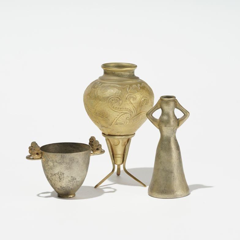 Porcelaine émaillée bleu nuit, anses en tête de griffon, monté e...