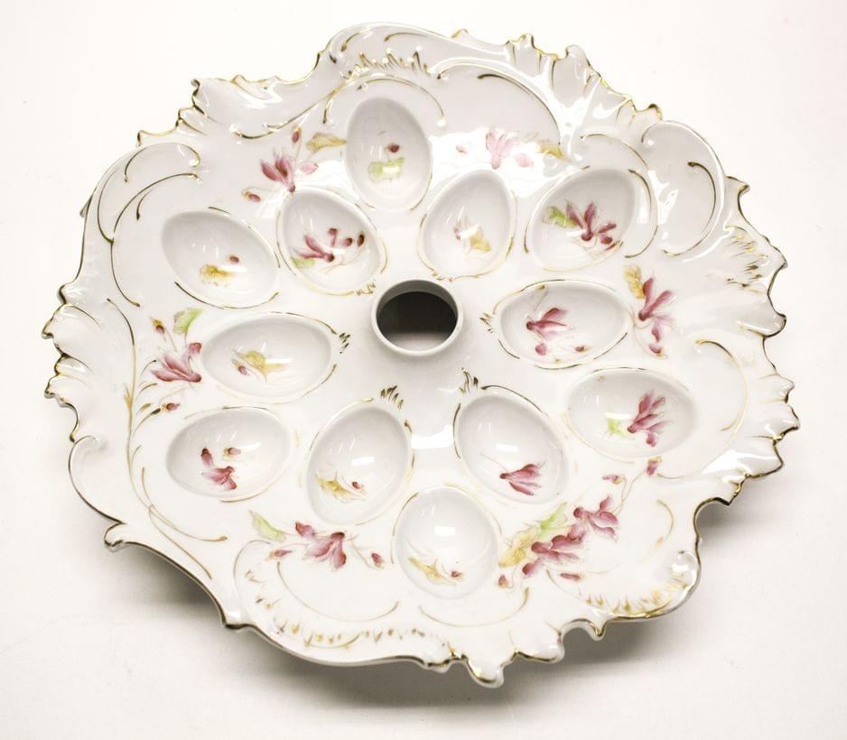 3138. Amusant présentoir à oeufs à bordure mouvementée et décor de fleurs roses