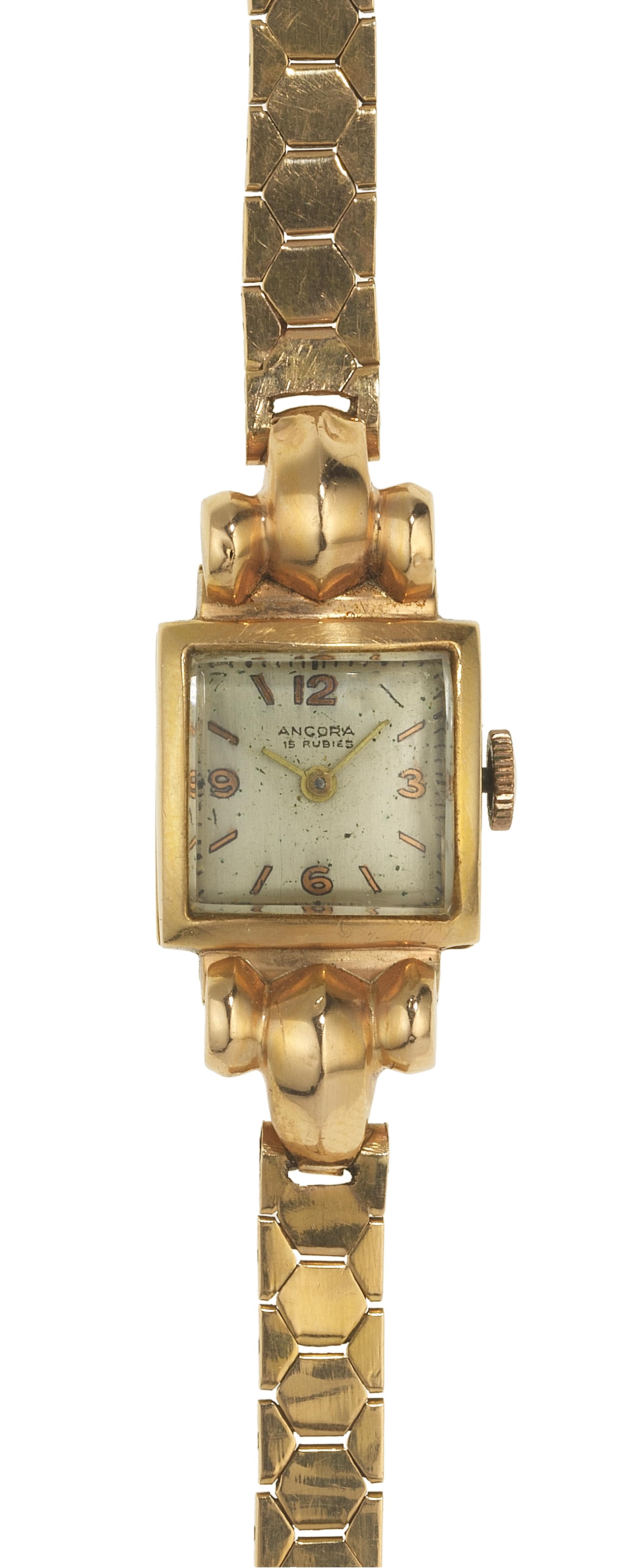 Cadran gris, aiguilles dorées, chiffres arabes rosés, or rose 750, 17x17 mm, L env. 18 cm, poids brut 23 g