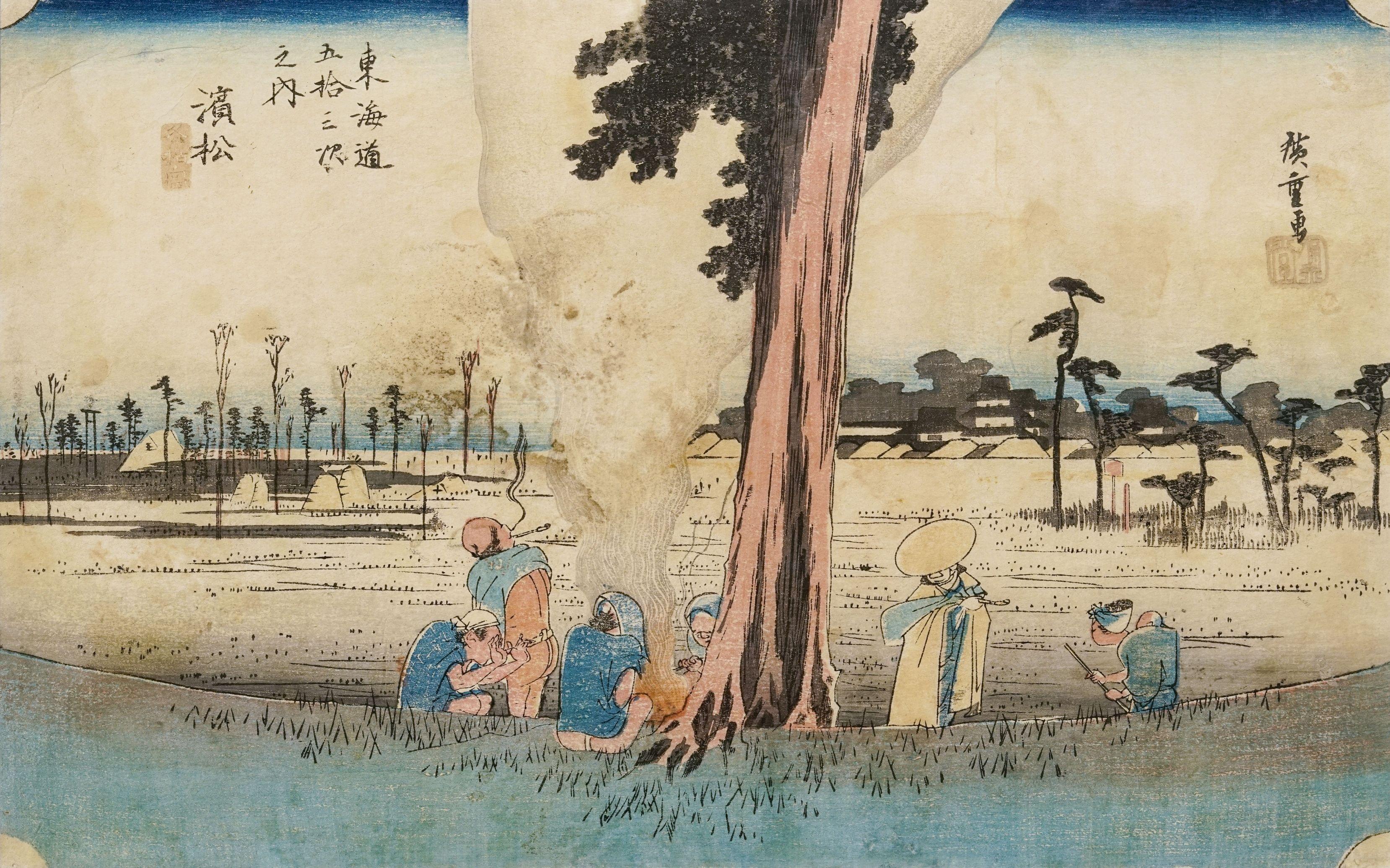 d'après la série des 53 stations du Tokaido représentant des voyageurs se chauffant près d'un feu pendant une nuit d'hiver,