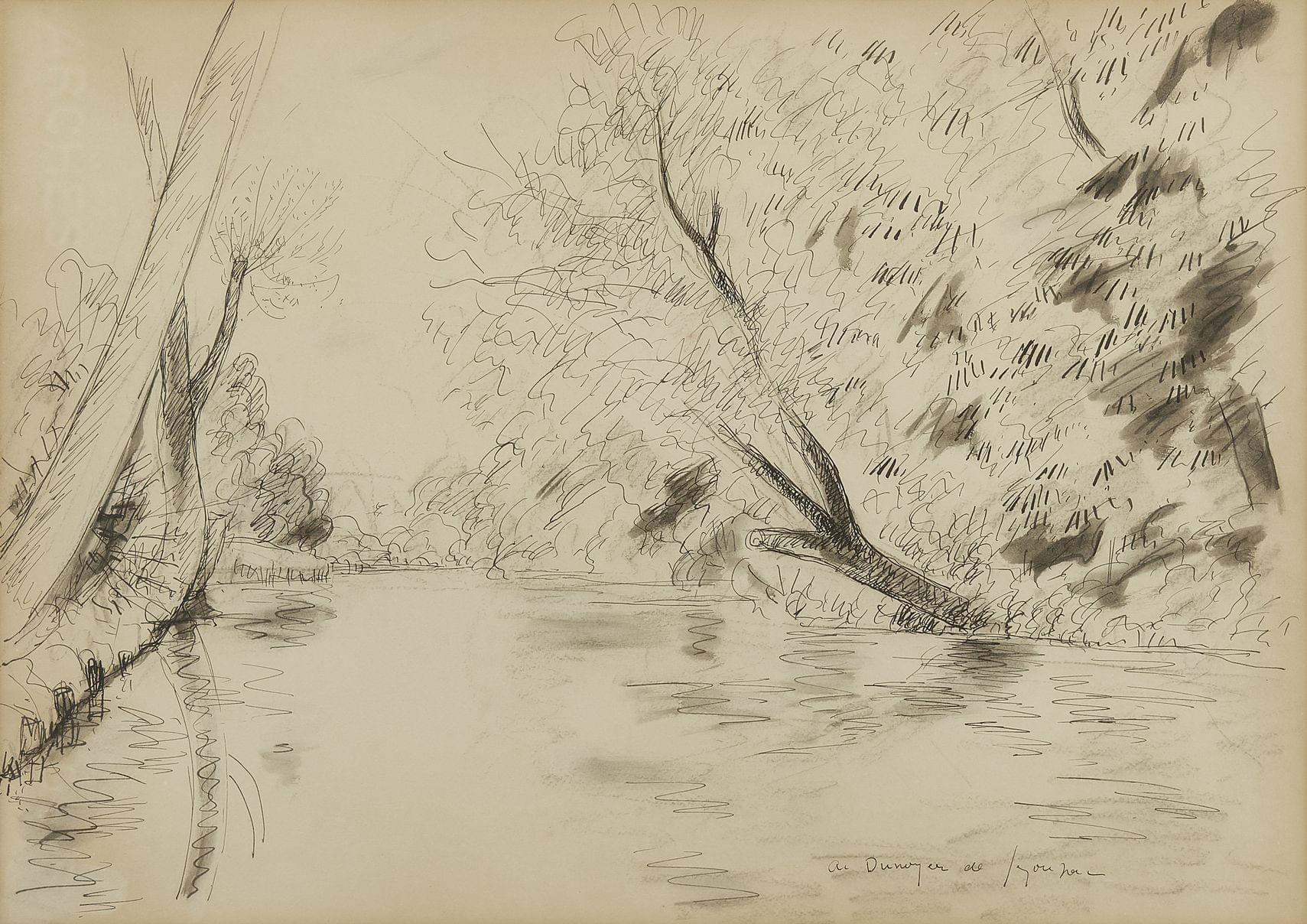 Rivière, fusain et crayon sur papier, signé, 34x48 cm