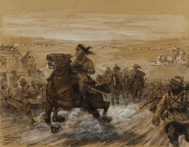 Charge de cavalerie, crayon, lavis et gouache sur papier, signée...