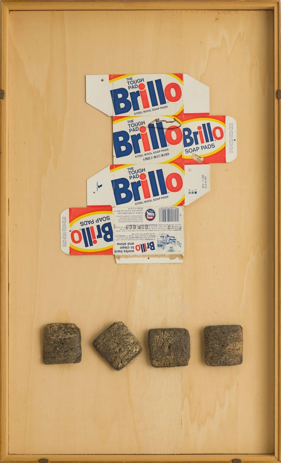 Emballage Brillo, quatre tampons, technique mixte, signée, pièce unique, 72,5x44x5,5 cm