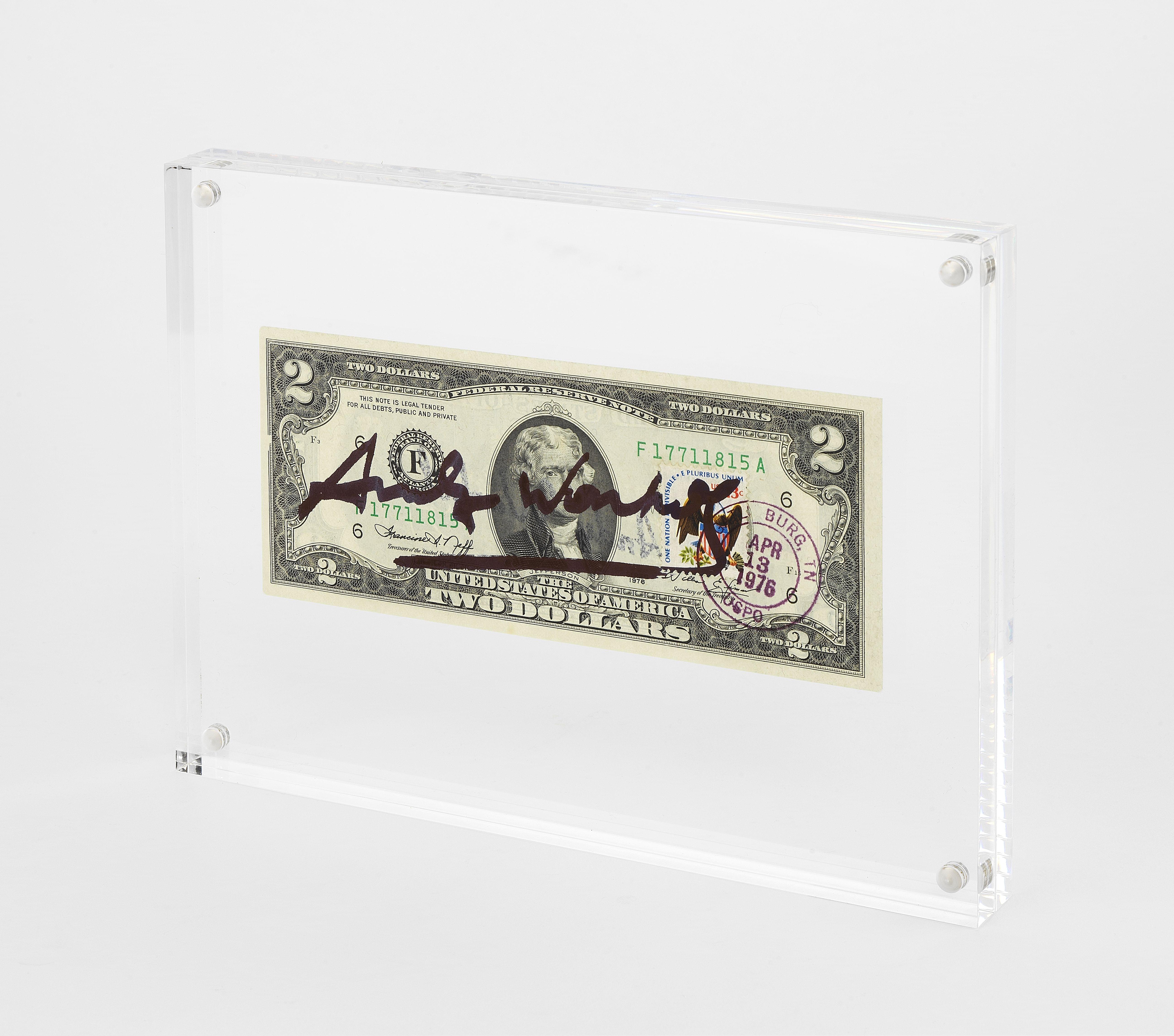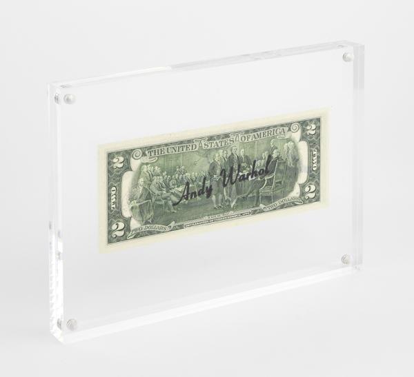 Deux dollars, billet F17711815A, sous plexiglas, avec un certificat d'authenticité de la Galerie 32, année 1976, 6,5x15,5 cm