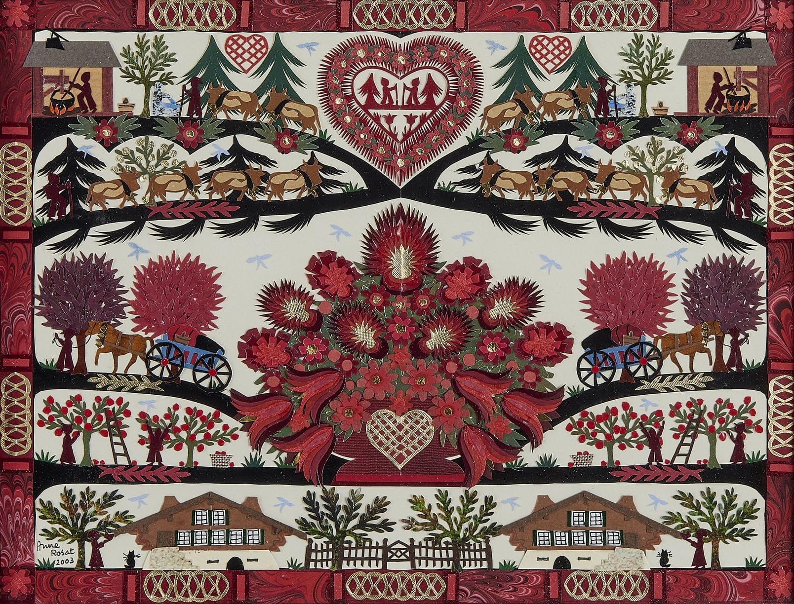 Découpage à motif d'un bouquet de fleurs, chalets et vergers, signé, 21x28 cm