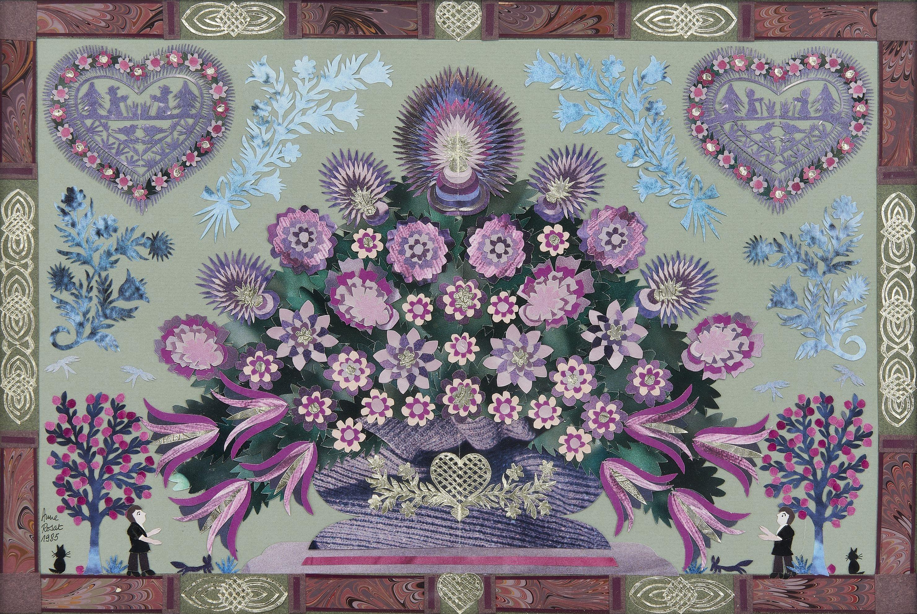 Découpage à motif d'un bouquet de fleurs, signé et daté 1985, 23,5x35 cm. Provenance : collection de bibliophiles et d’amateurs d’art suisses de père en fils, 1920-2020