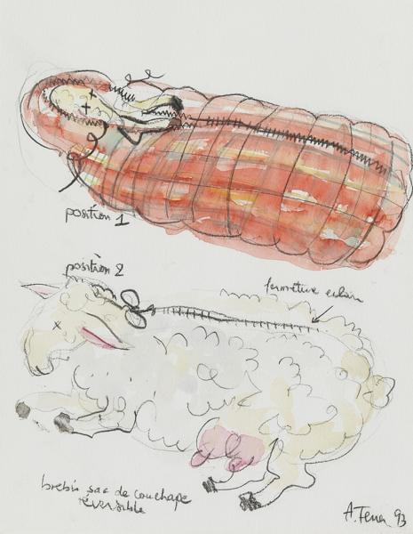 Brebis sac de couchage réversible, aquarelle et fusain sur papie...