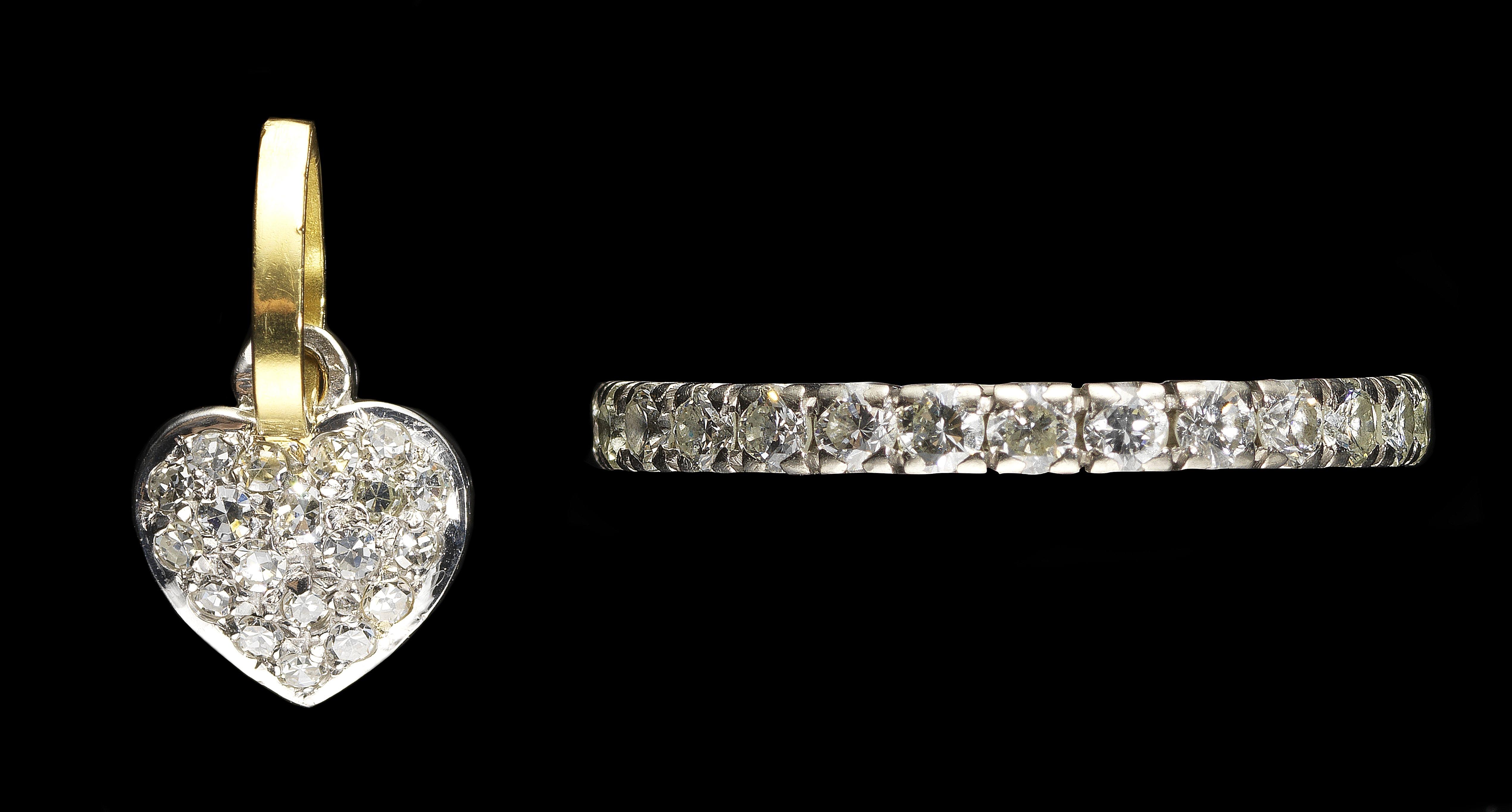 Or gris 750, doigt 53-13. On joint un pendentif cœur pavé de diamants, or et or gris 750, H 1,5 cm.