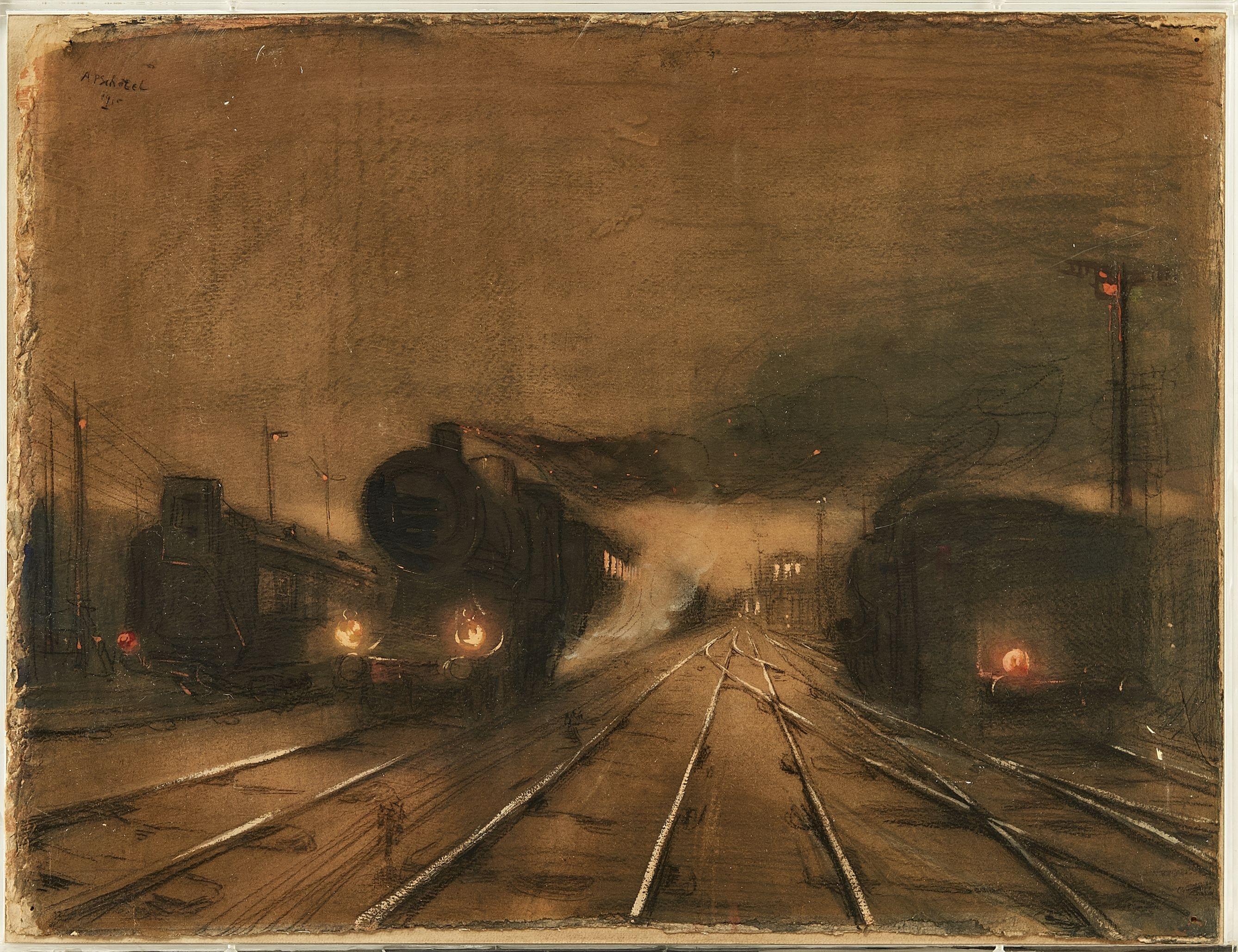Locomotives, pastel sur papier, signé et daté 1915, 39x51 cm