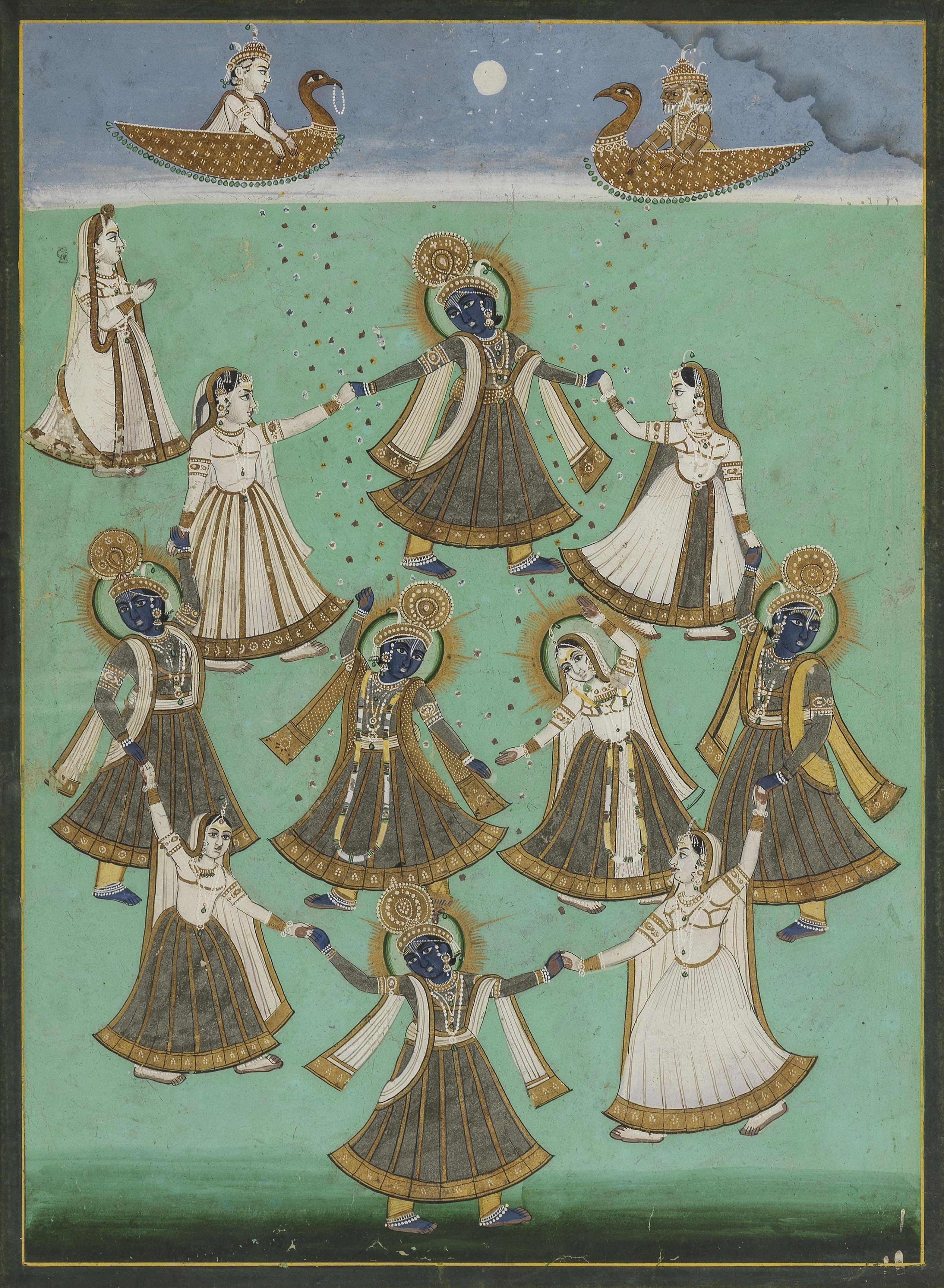 Rasa-Lila, danse de Krishna avec diverses Gopis, gouache et or sur papier, 36x25 cm