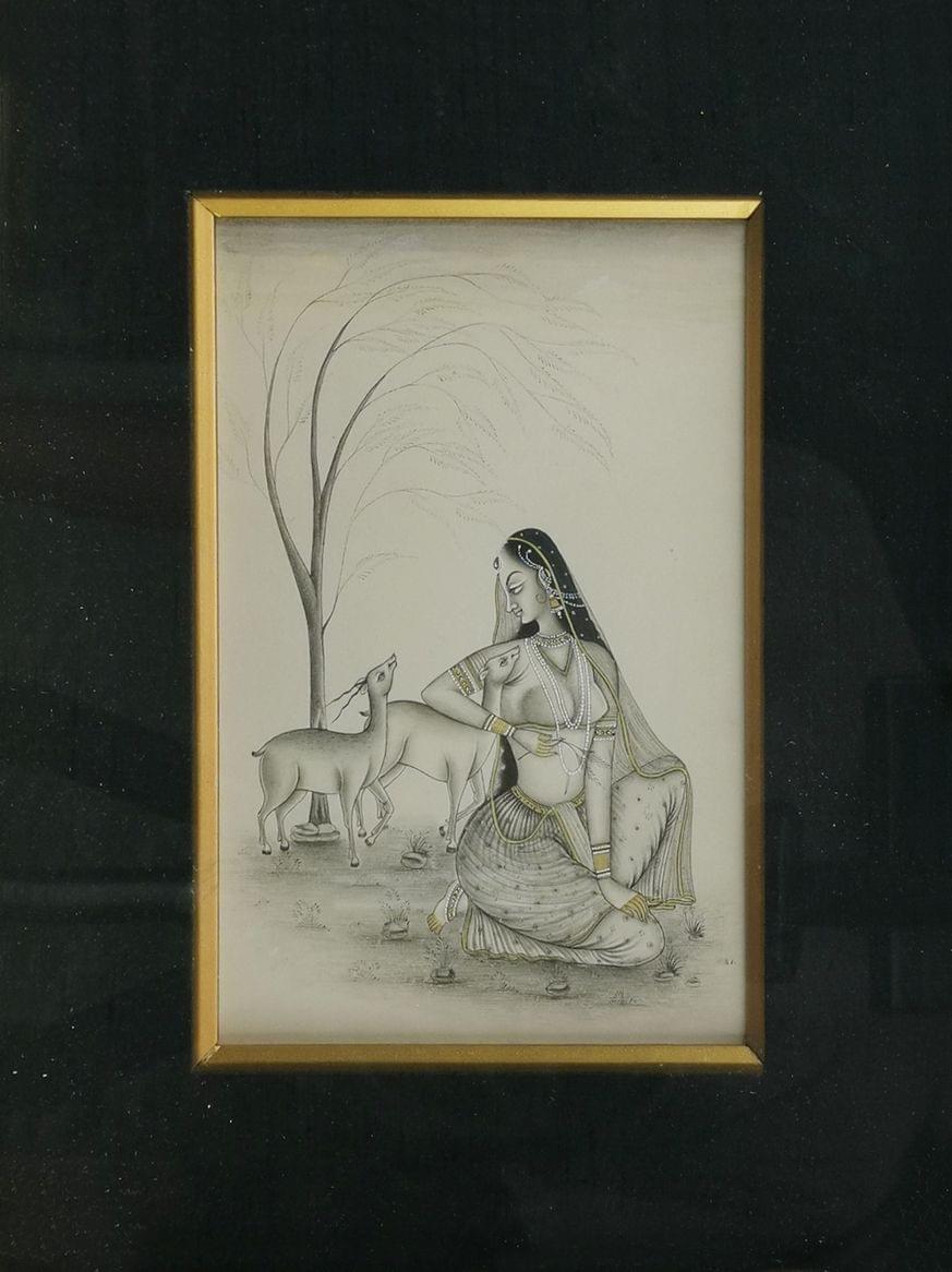 Femme au collier et cervidé, miniature en grisaille sur papier, 19x13 cm