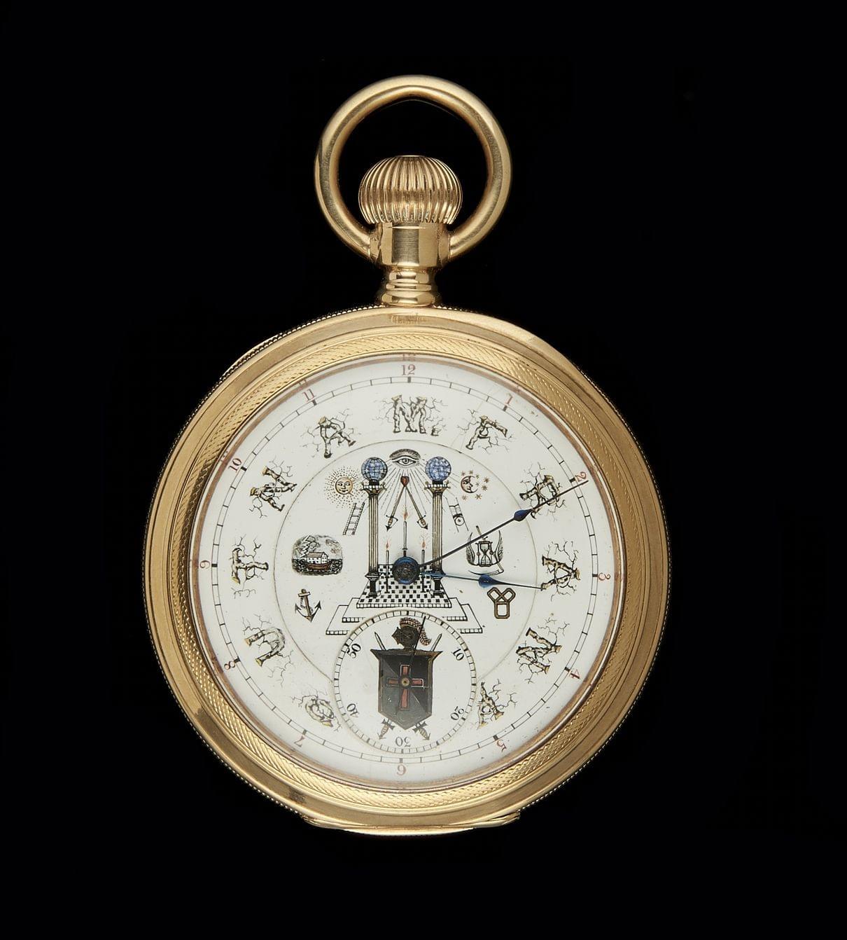 374. ANTIQUITES DE PLUS DE 100 ANS D'AGE Montre de poche guillochée décorée de symboles maçonniques