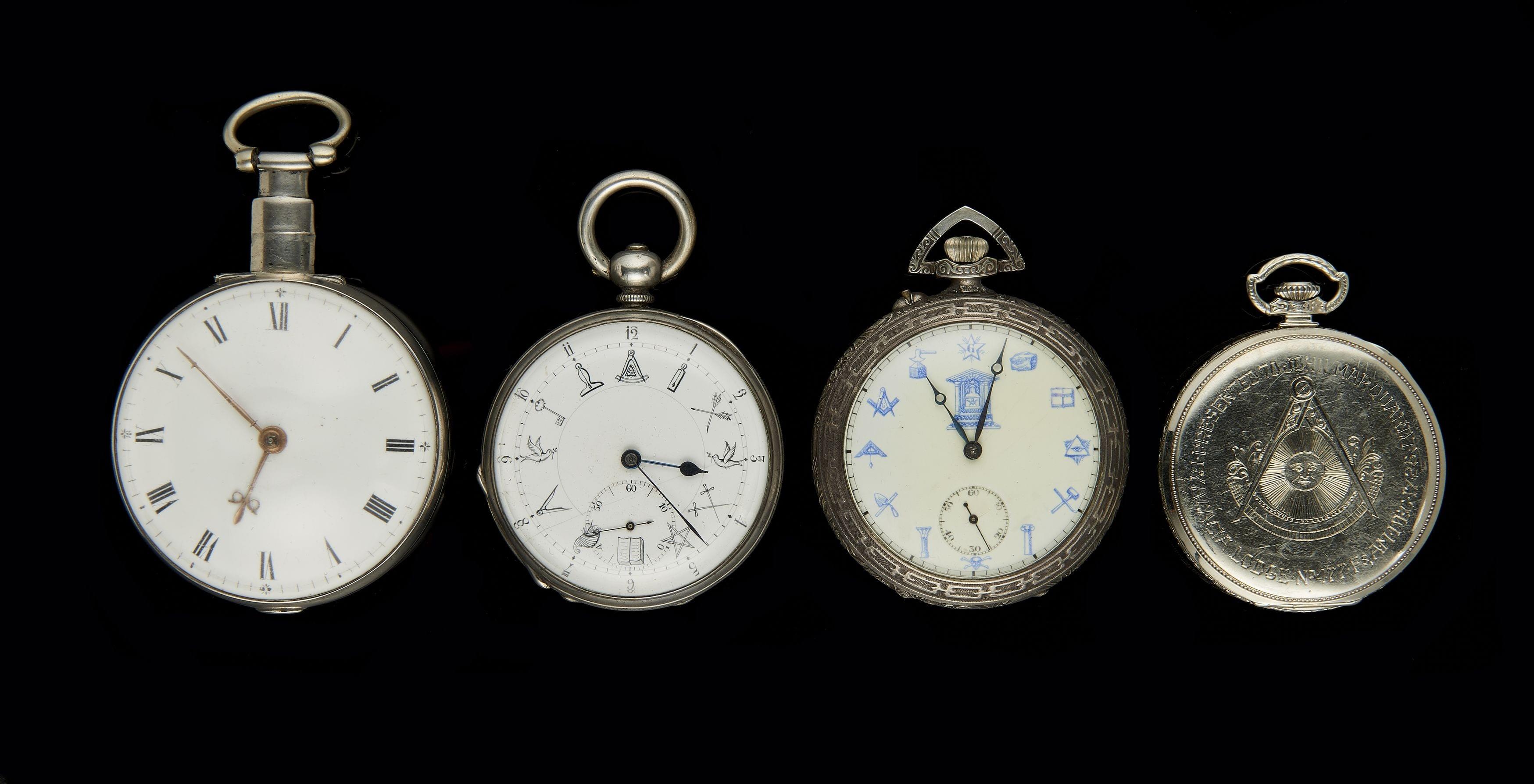 375. ANTIQUITES DE PLUS DE 100 ANS D'AGELot de trois montres de poche décorées de symboles maçonniques, l'une signée Hamilton