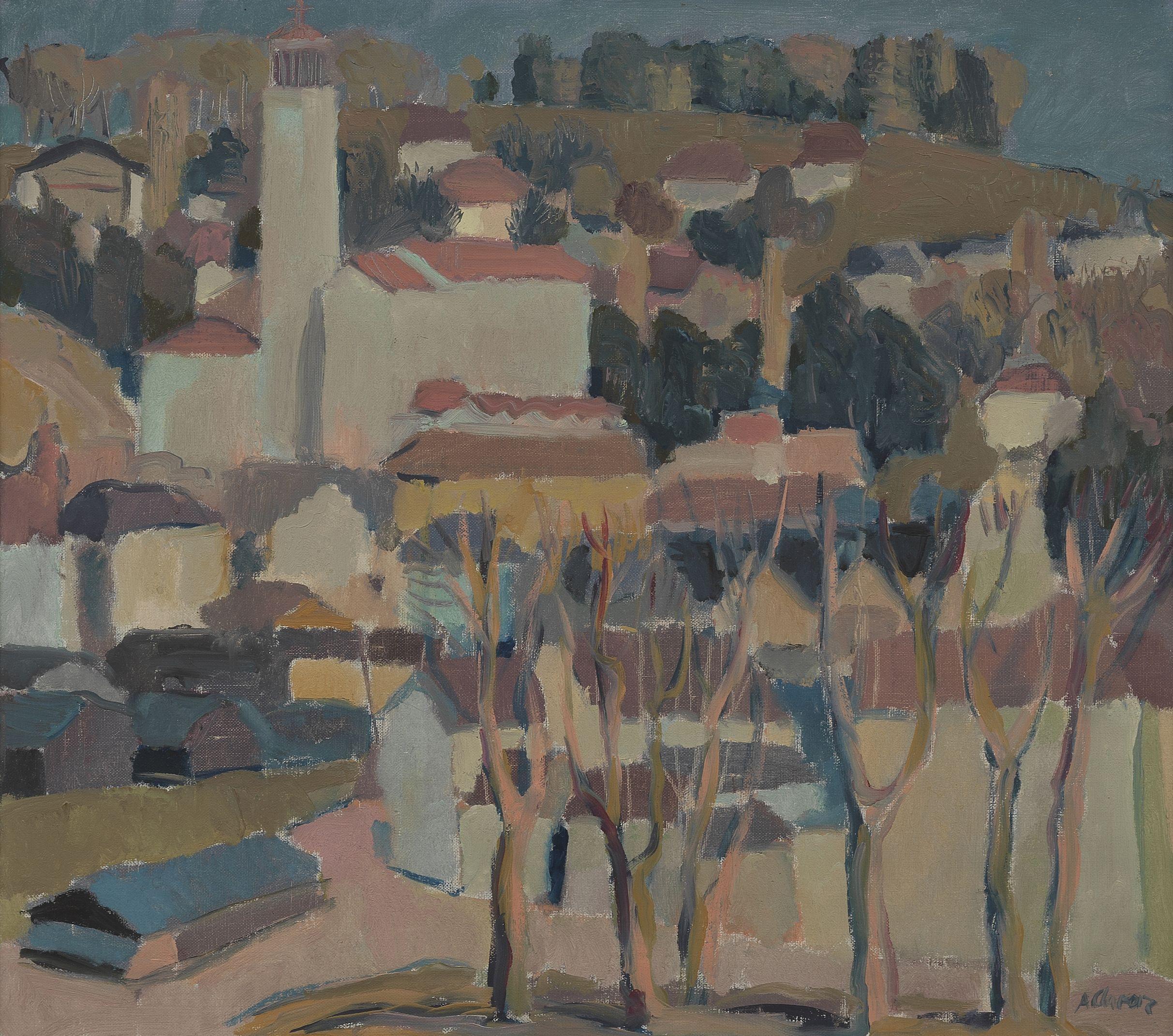 Vue sur l'église Saint-Pierre à Fribourg, huile sur toile, signée, 55x62 cm