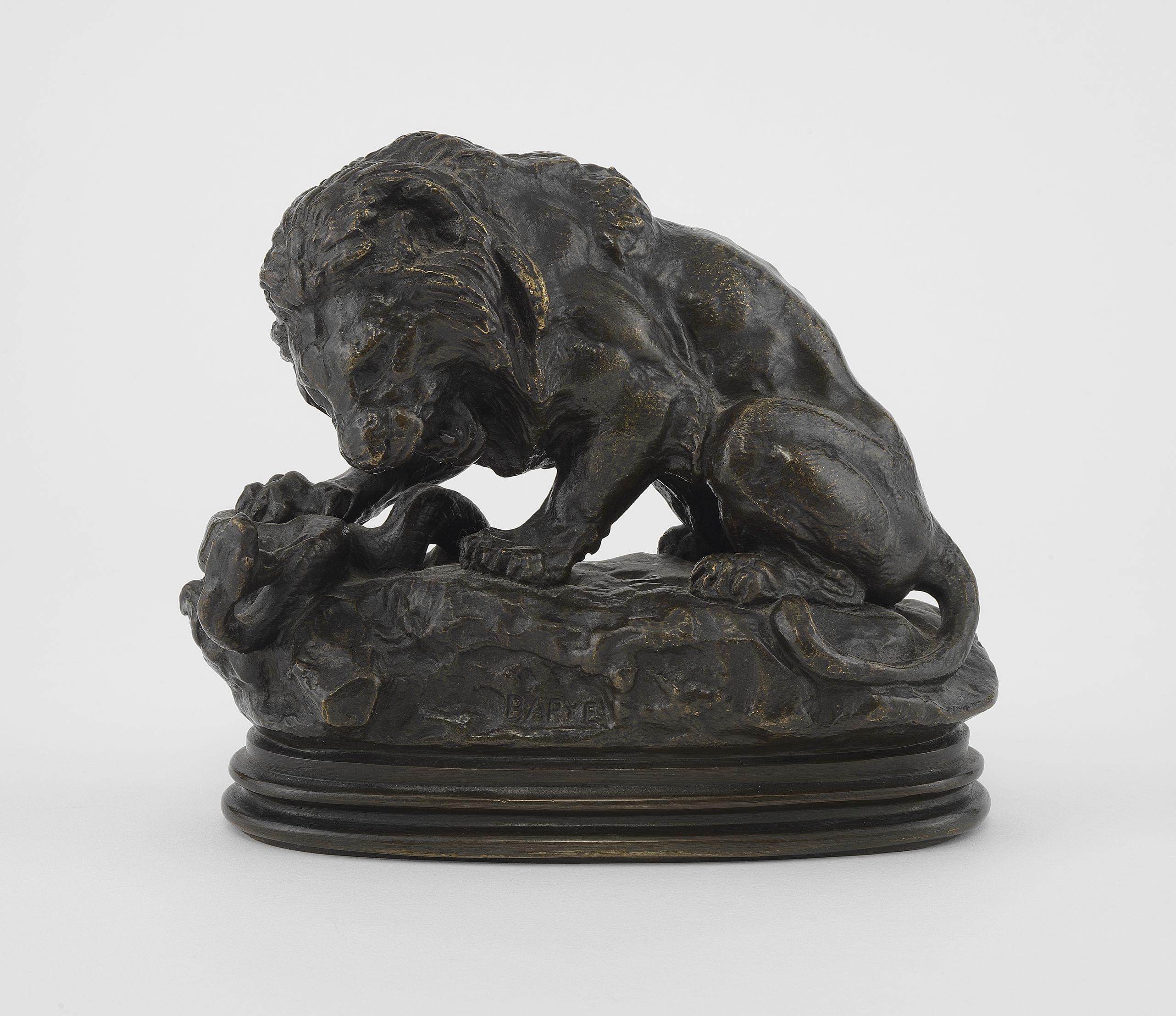 Lion au serpent, bronze à patine brune, signé, L 19 cm