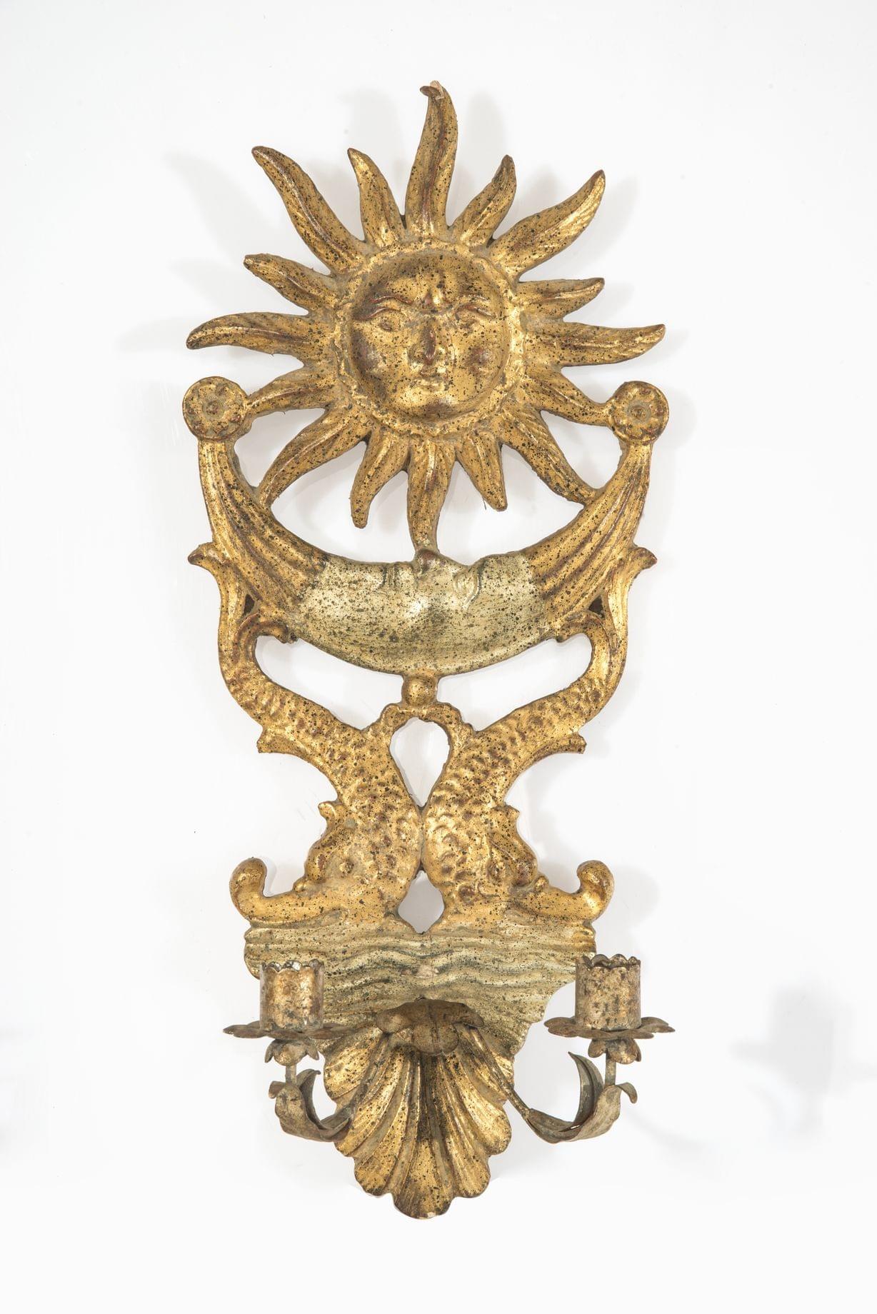 Bois sculpté d'un soleil, de la lune et de deux dauphins, métal doré, XIXe s, H 52 cm