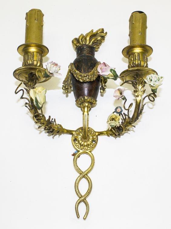 Bronze doré et ciselé, porcelaine émaillée polychrome à décor de fleurs et bois peint, H 31 cm