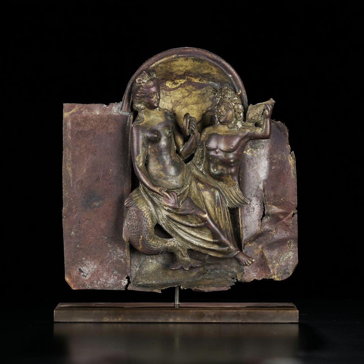 A late roman, early bizantine partially gilted bronze applique with Triton. Provenance: swiss private collection