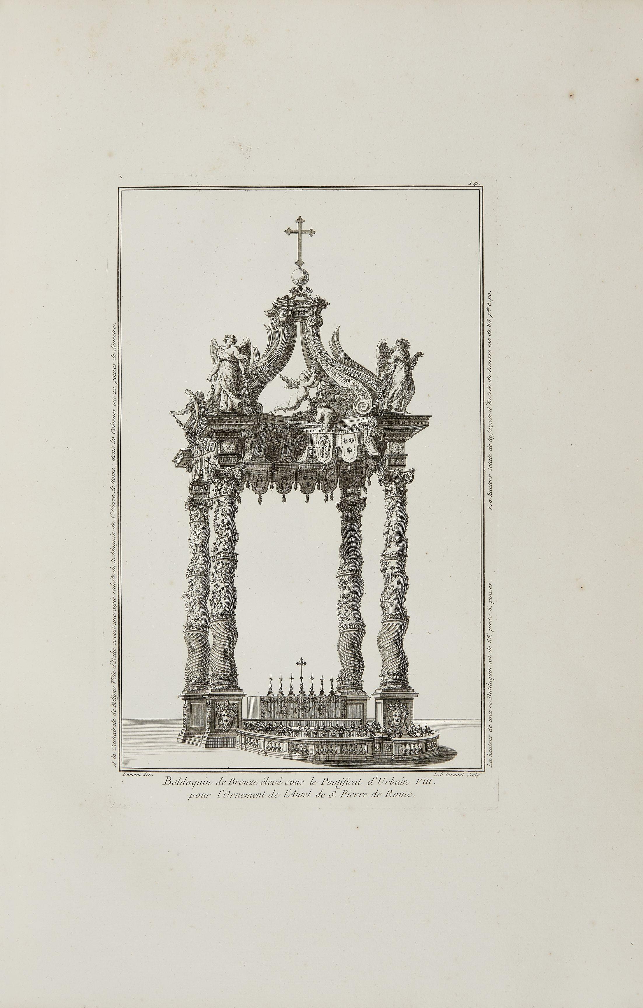 levés et dessinés sur le lieu. Paris, chez l’Auteur et chez Madame Chéreau, 1763; Grand in folio, cartonnage fauve jaspé d’attente. Portrait de l’auteur gravé par MOREAU le Jeune. Ouvrage important ; il est composé de 14 pl. gravées num. et trois non num., du Parallèle, qui comprend un feuillet, 70 pl. gravées num. et 2 pl. non num., des trois feuillets d’Extrait des Registres et d’une planche à double page, représentant le Plan du Palais du Vatican. (coiffes et mors fragiles).