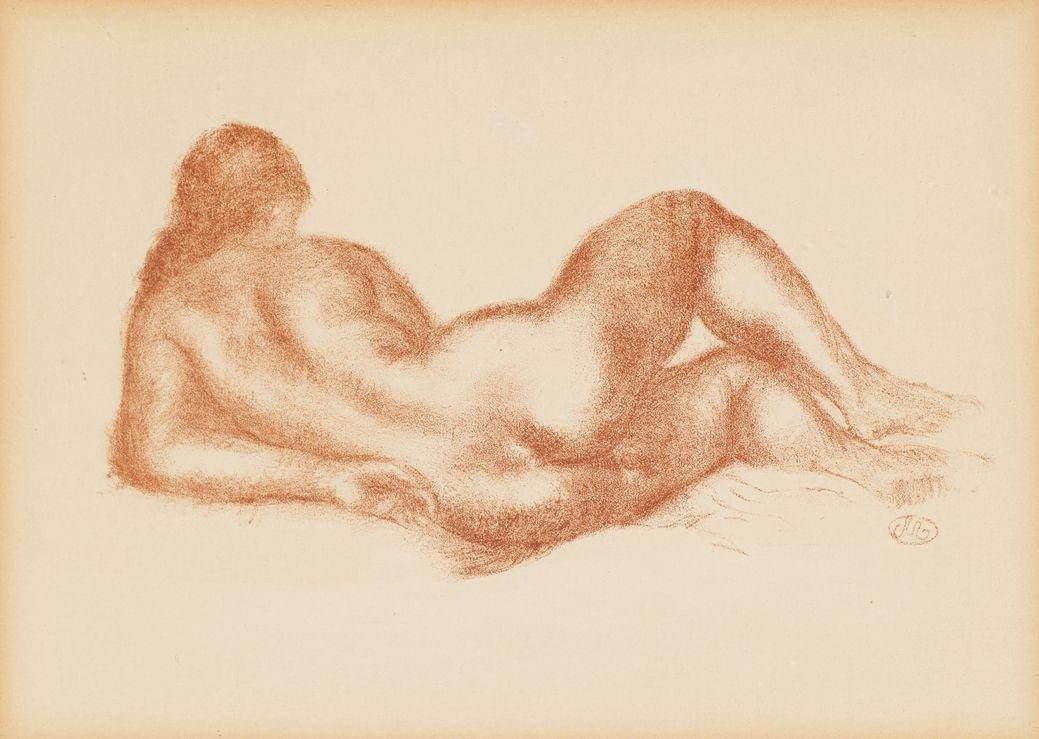 Nu assis de dos, fusain sur papier, monogrammé, 25x32 cm