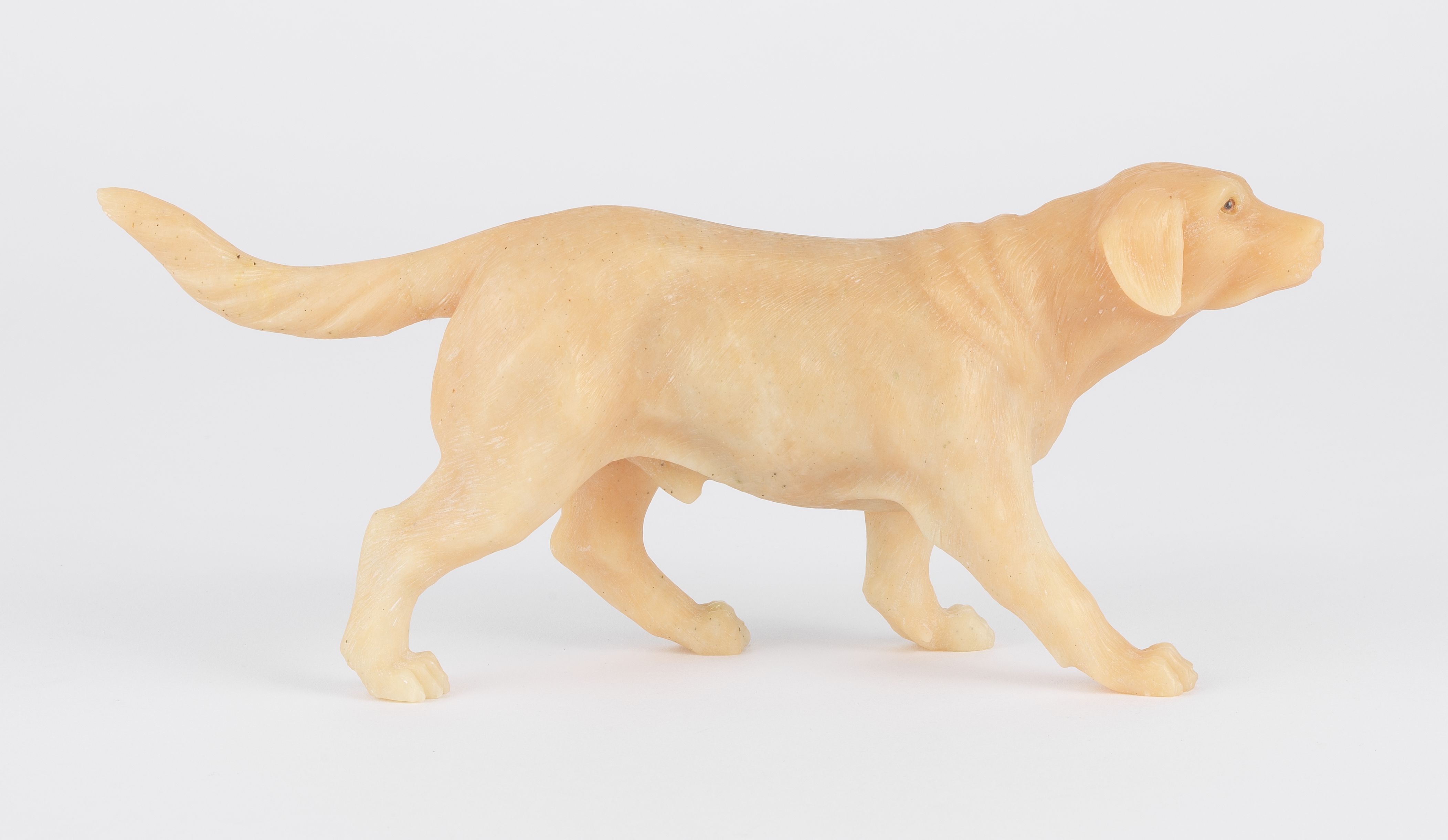 Labrador, figure animalière, aragonite beige rosé, signé, L 18 c...