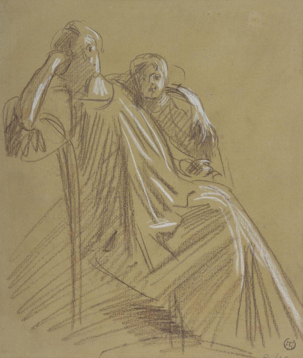 Etude de femme drapée à l'enfant, crayon gras et craie blanche sur papier signé et cachet du monogramme, 26x22 cm