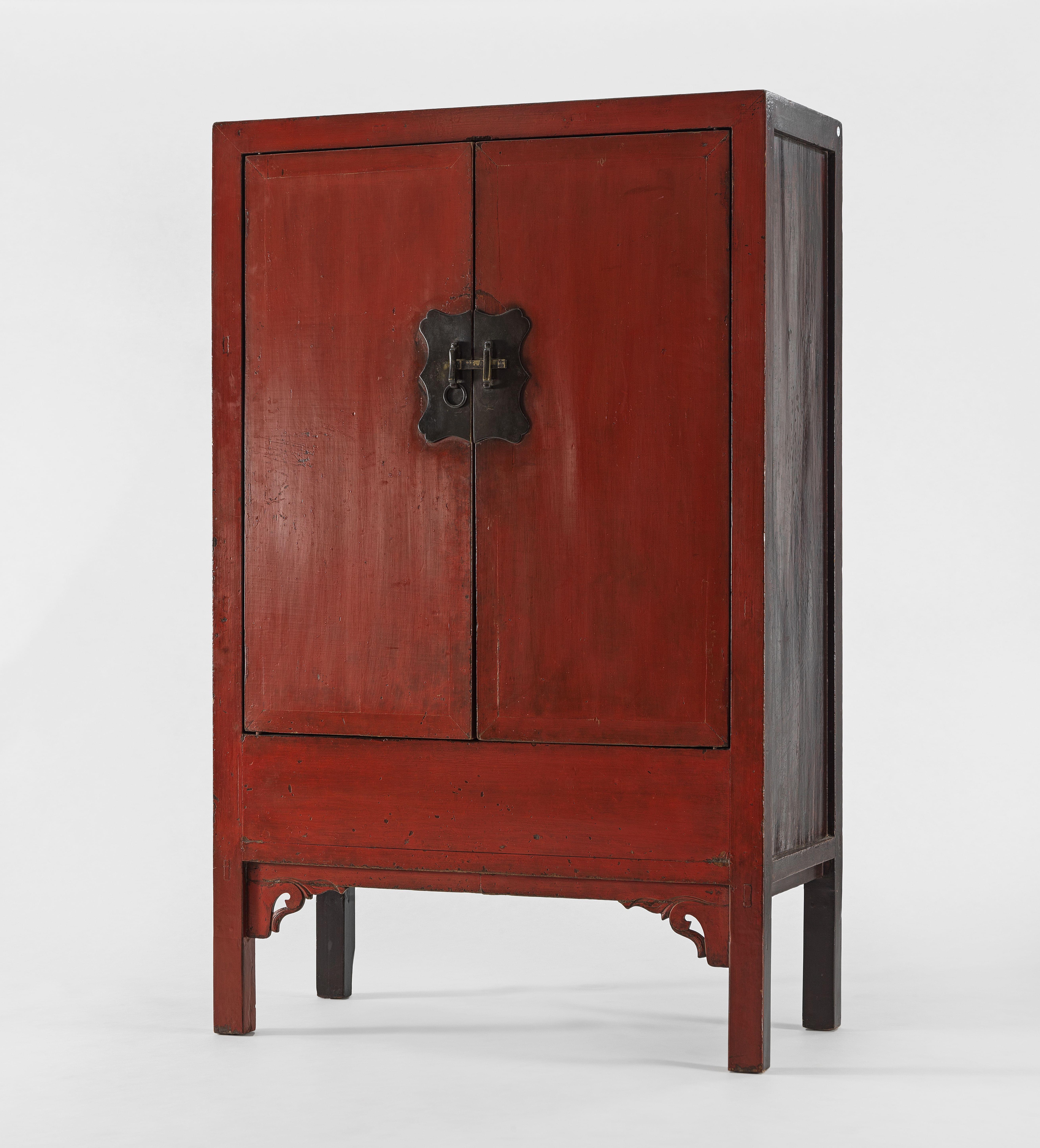 Bois laqué rouge, médaillon central en laiton, 185x115x53 cm