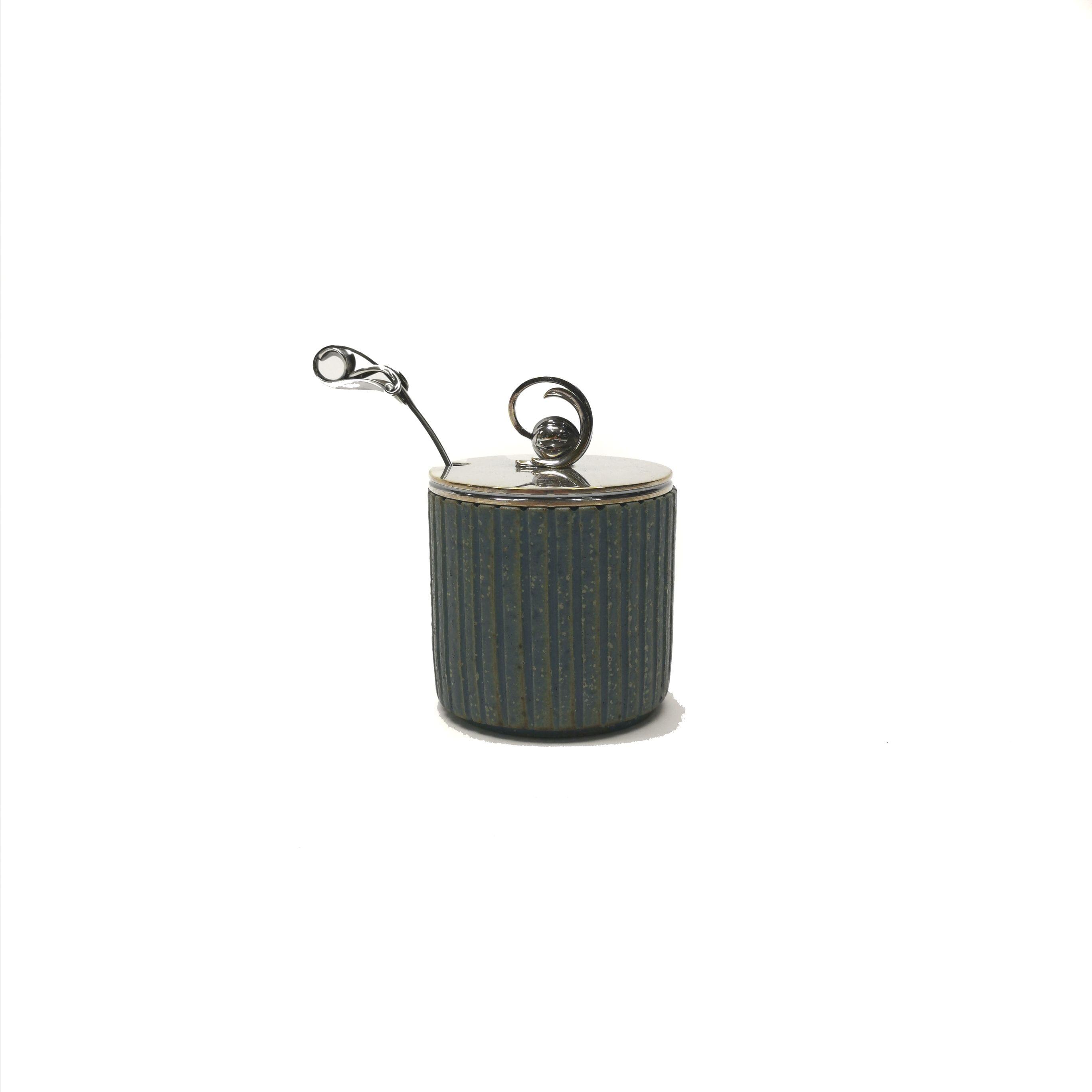 Confiturier cannelé à prise de volute végétale, céramique émaillée bleu et métal argenté, H 12 cm. On joint une cuillère assortie, Danemark, 1948, argent 40 g.