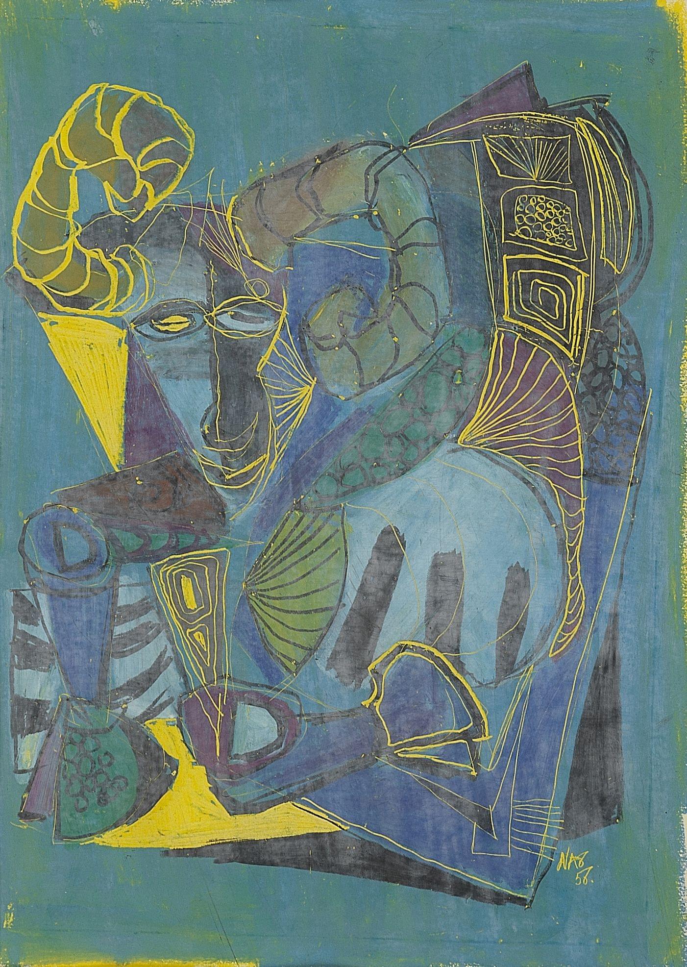 Composition au minotaure, gouache sur papier, monogrammée et datée 56, 31x22 cm