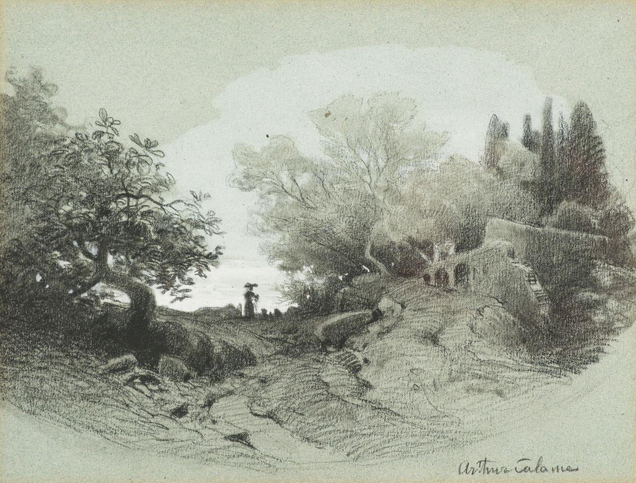 Les temples de Paestum, mine d'argent signée, 1844, 23x31,5 cm