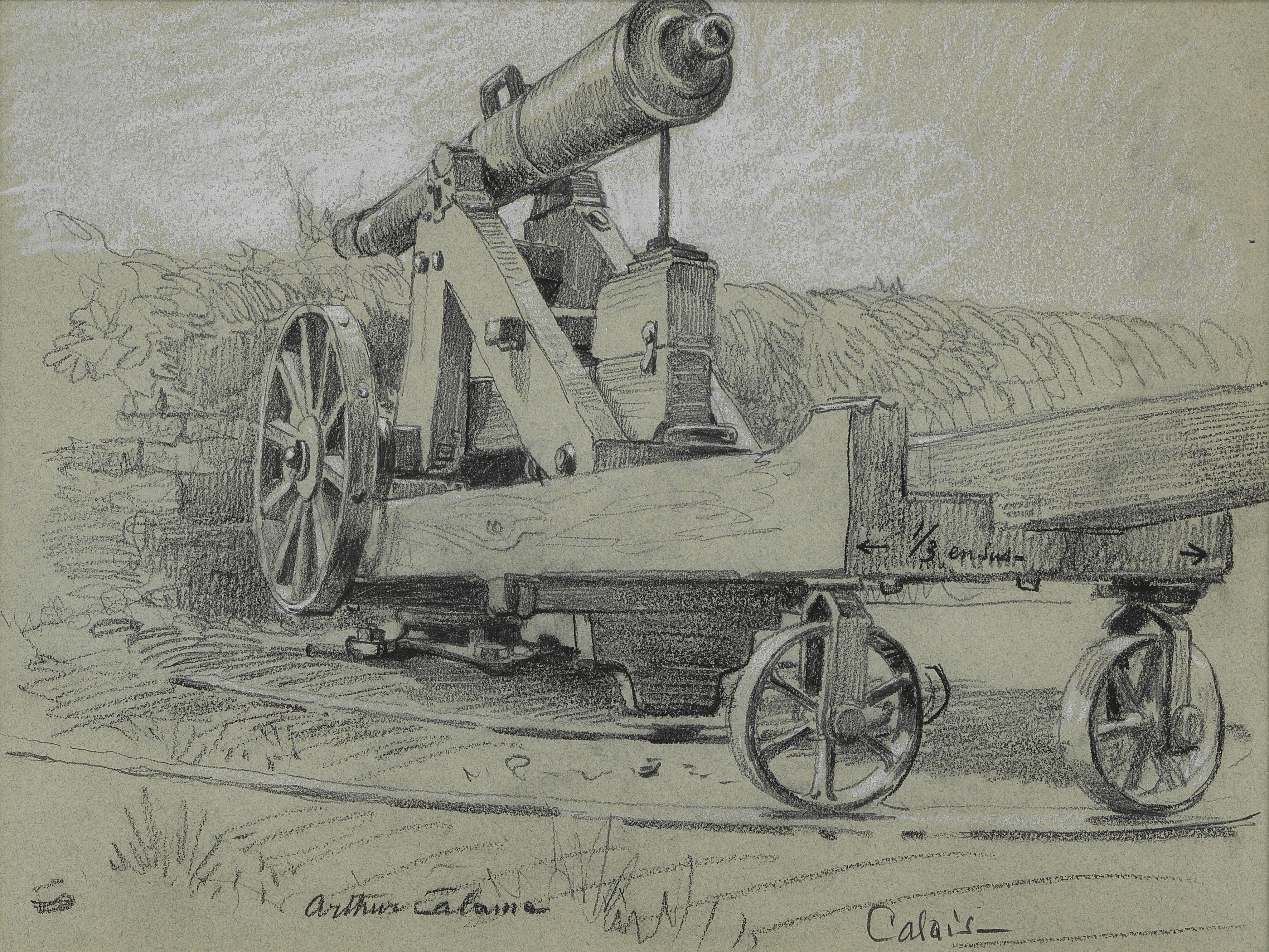 Canon à Calais, mine de plomb, signée, 23x30 cm