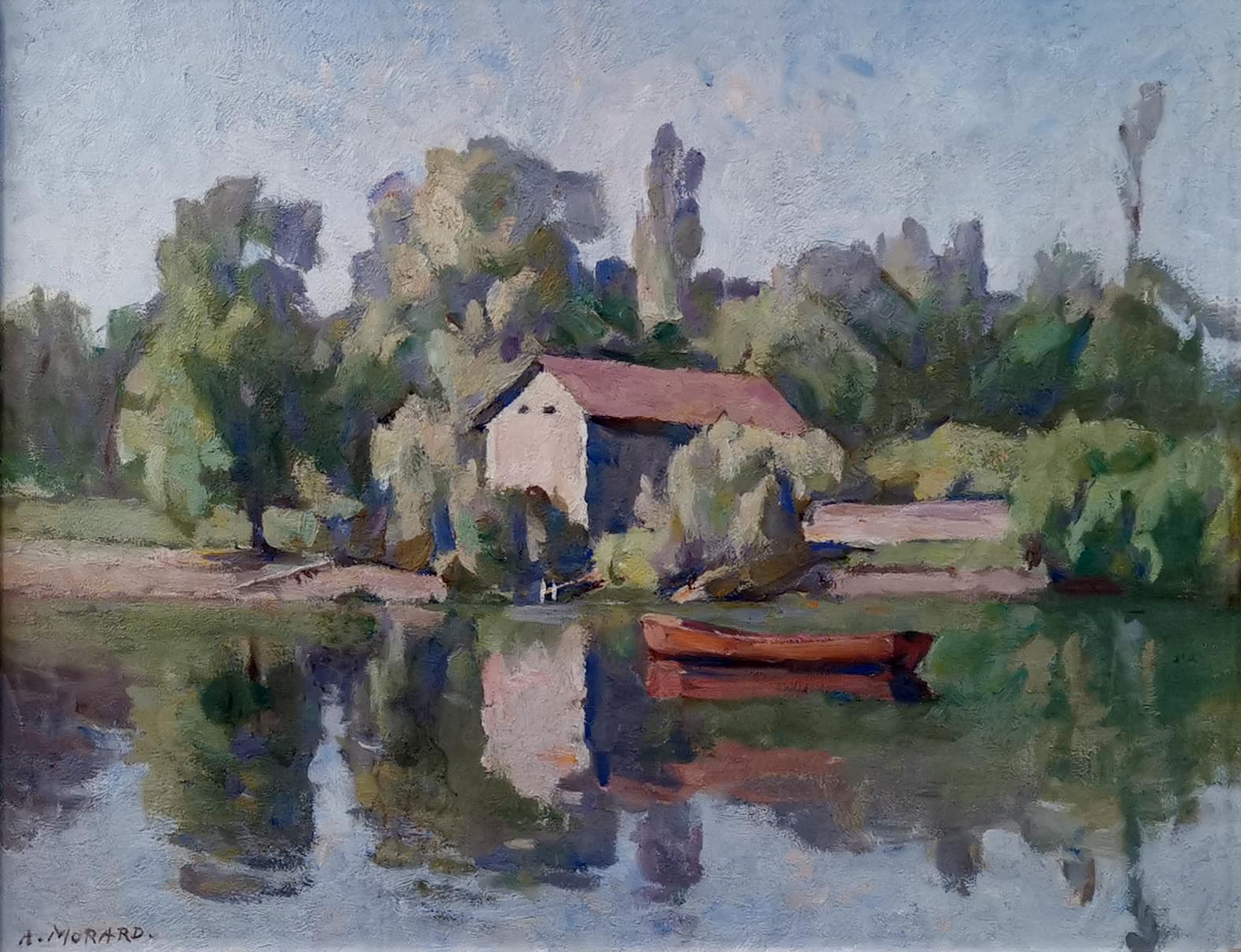 Barque sur le lac, huile sur toile, signée, 49x64 cm