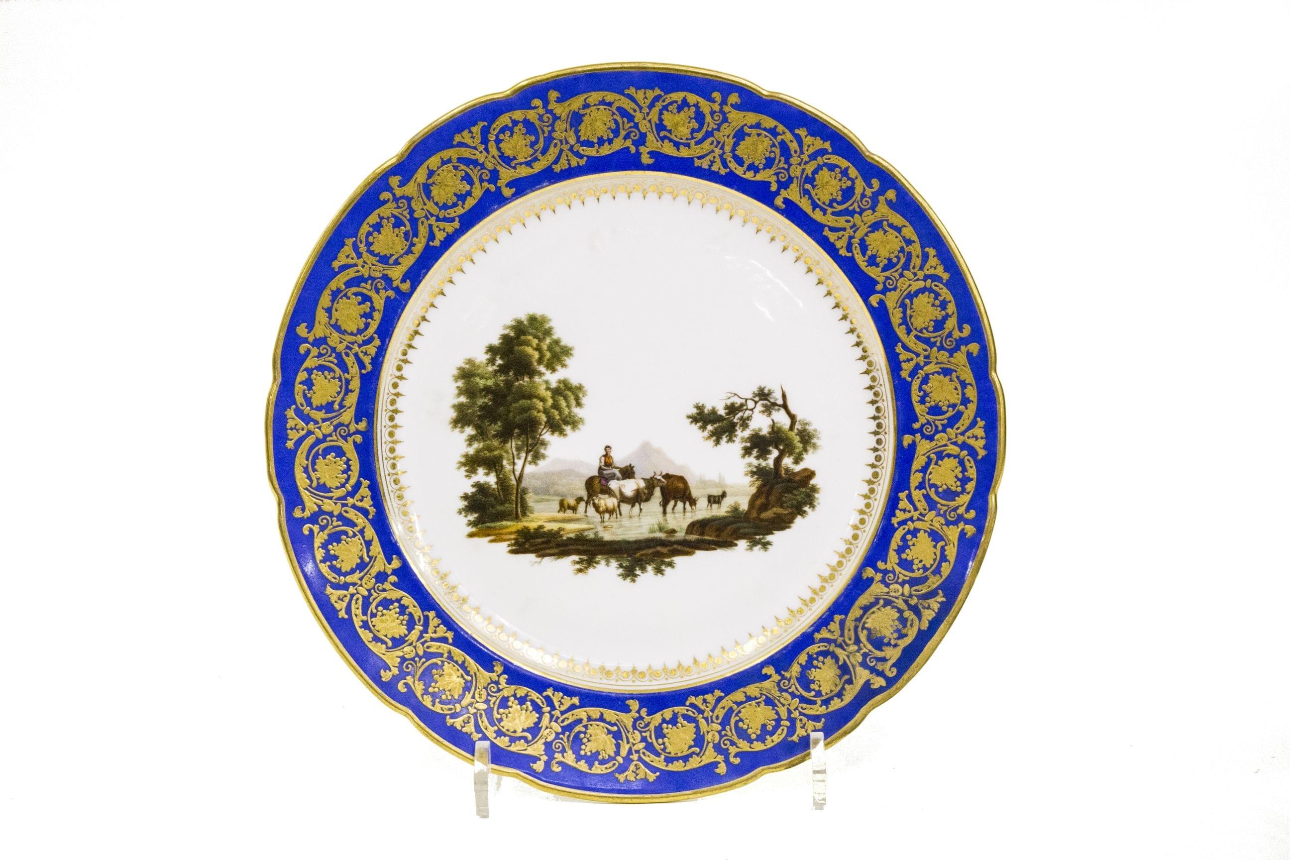 3268. Assiette à marli bleu nuit orné de rinceaux dorés et au centre d'une scène pastorale