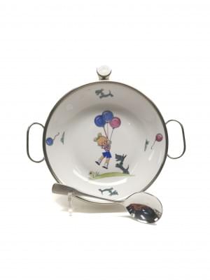 3547. Assiette à bouillie de bébé sur bain-marie à décor de chien et g...
