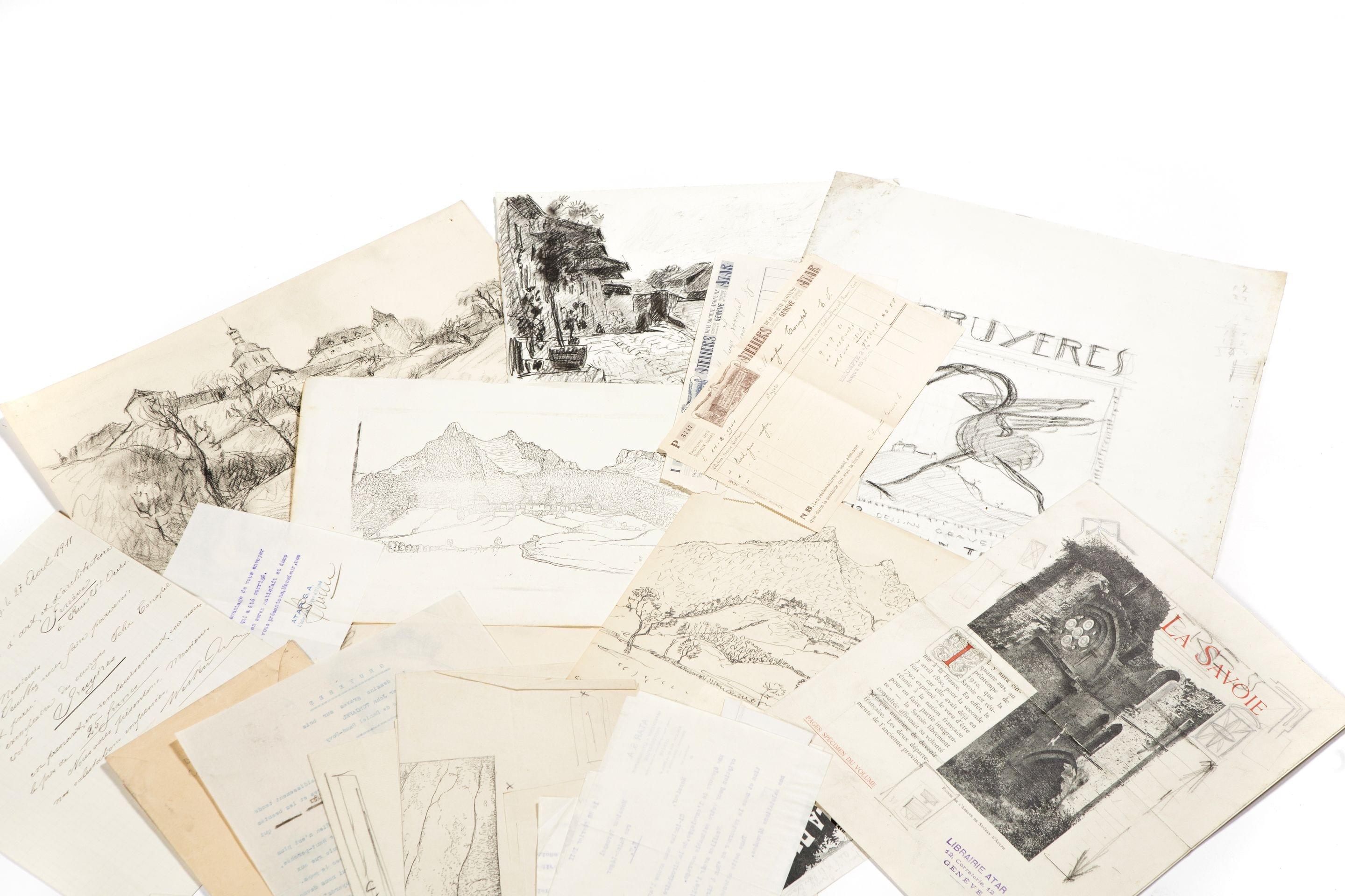 Ensemble d'études au fusain et à la mine de plomb autour de la ville de Gruyères. On joint une documentation sur l'édition de douze dessins gravés par le peintre sur ce thème et préfacé par Daniel Baud-Bovy, dim. Diverses