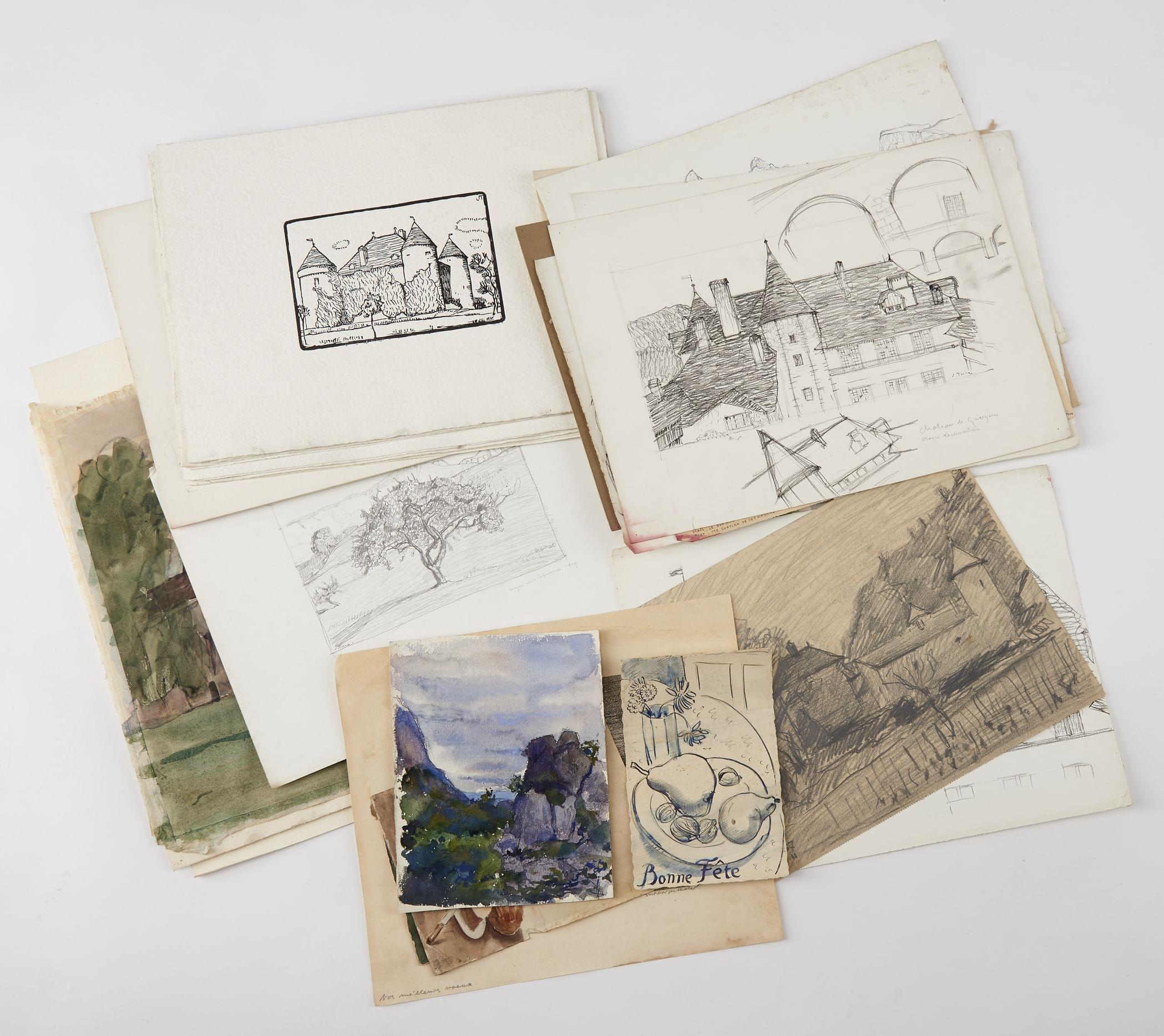 Ensemble de croquis, études, dessins et aquarelles divers, Suisse (châteaux, montagnes, Fribourg, Gruyères ), dim. Diverses