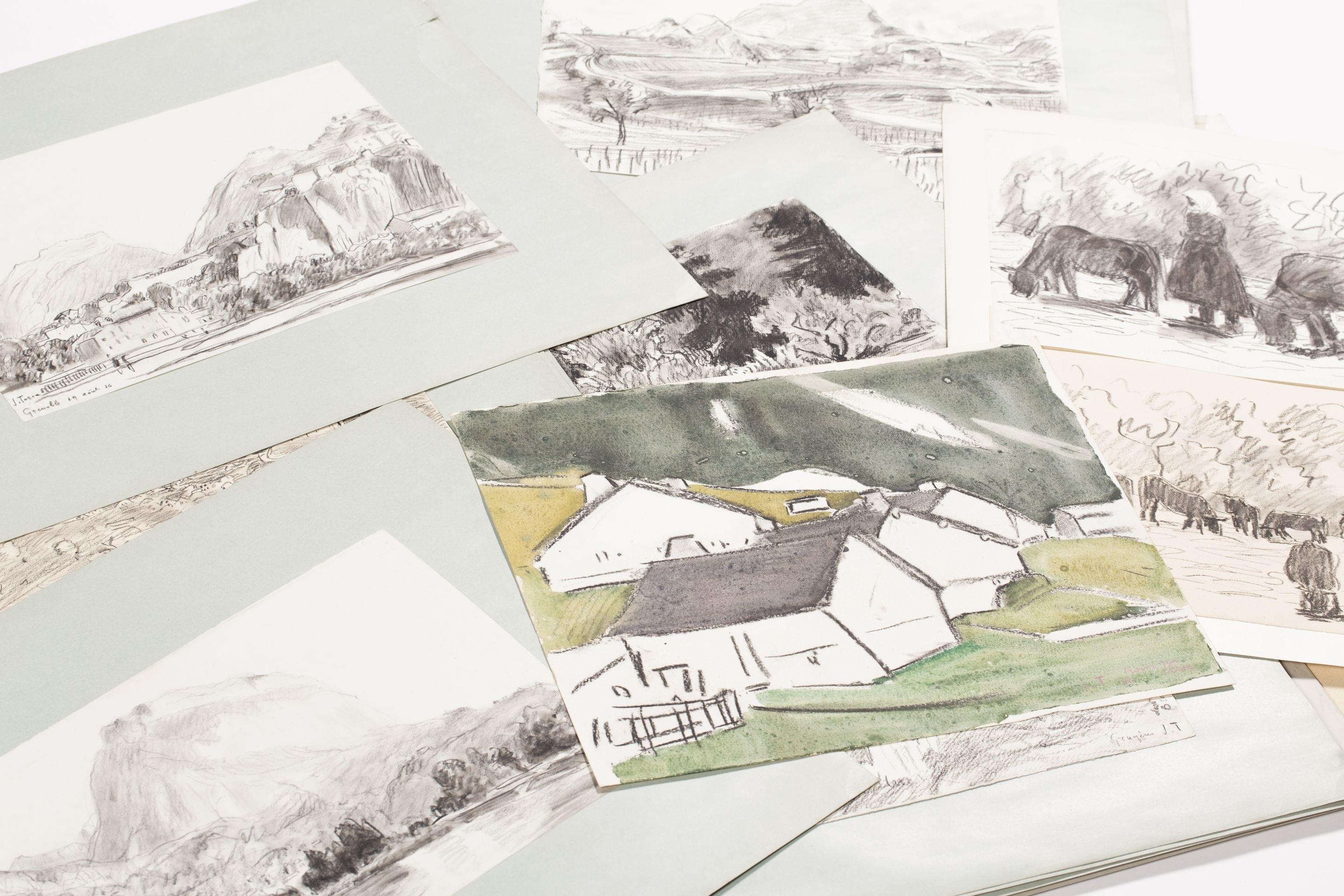 Ensemble de croquis, études et dessins divers, Suisse et France au fusain et à la mine de plomb, couvrant essentiellement les années 1910-1920 , dim. de 28x34 à 38x30 cm