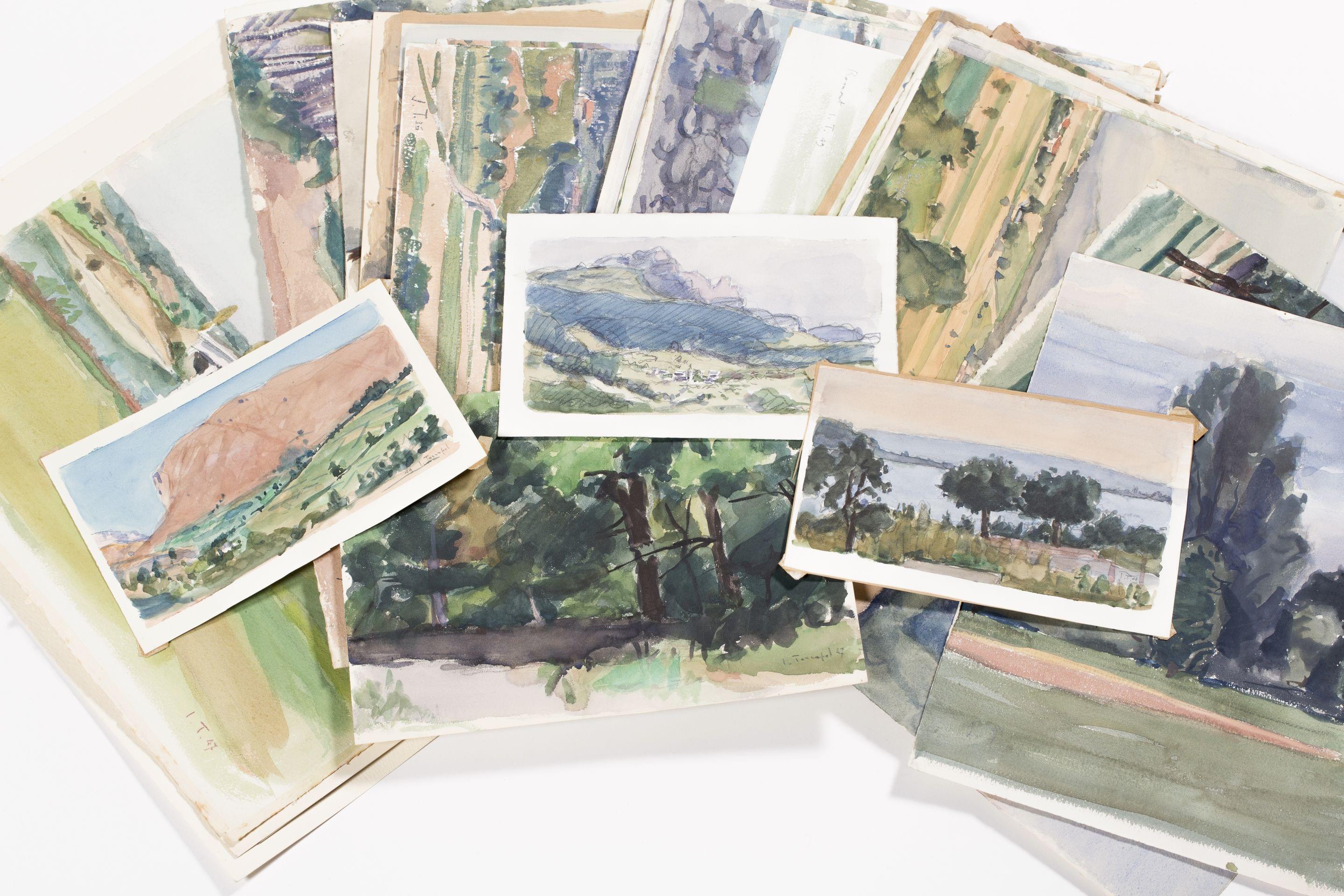 Ensemble de croquis, études et dessins divers, Suisse (Valais, Romont, lac de Bienne) à l'aquarelle, couvrant essentiellement les années 1920-1950, dim. de 15x24 à 28x41 cm