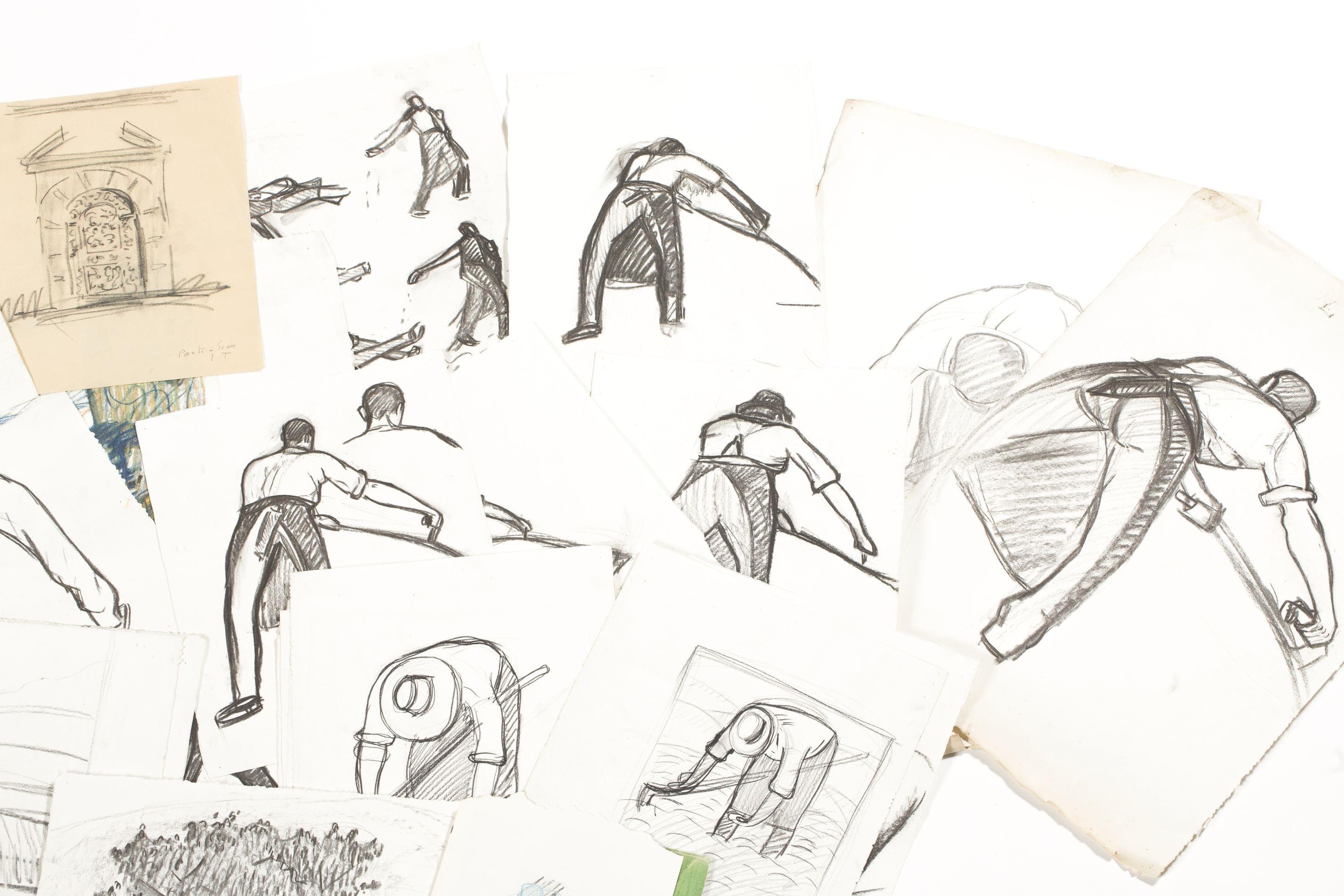 Ensemble de croquis, études et dessins, divers paysages et études de faucheurs, au fusain, crayon gras sur papier et papier calque, couvrant la période 1911-1950 , dim. de 11x8 à 48x32 cm