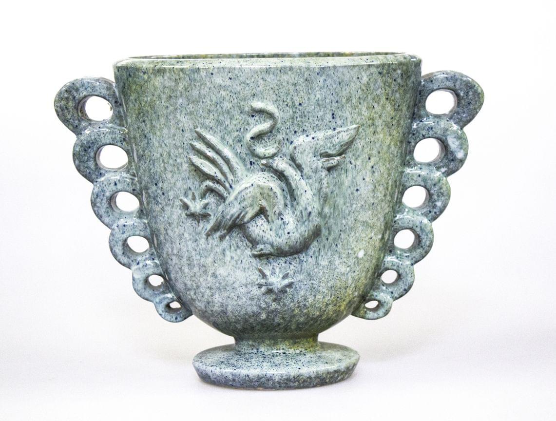 Vase à anses à volutes, céramique émaillée vert bleu à décor d'un oiseau en relief, signé, H 25 cm